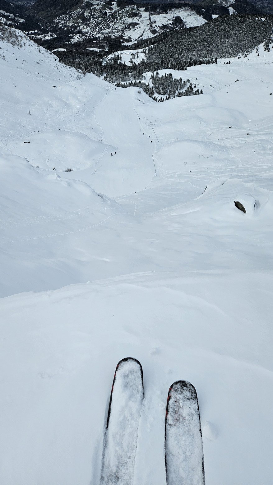 En haut cest plus hétérogène mais la sous couche est la en attendant les 3 prochains jours. Les gens avaient eu la bonté de me laisser un petit couloir de libre alors bonne neige en descente. Ça promet !