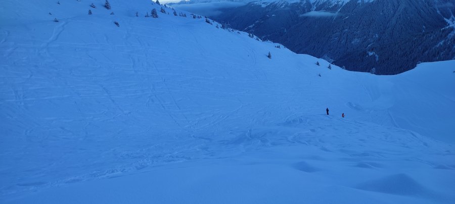 Le siège ouvre, je descends vite sur le siège de l'Eterlou et je passe dans la combe sur la rouge d'Oursière : un régal même si on sent que sous les 10-15 cm de la nuit, les traces d'hier sont bien présentes.
