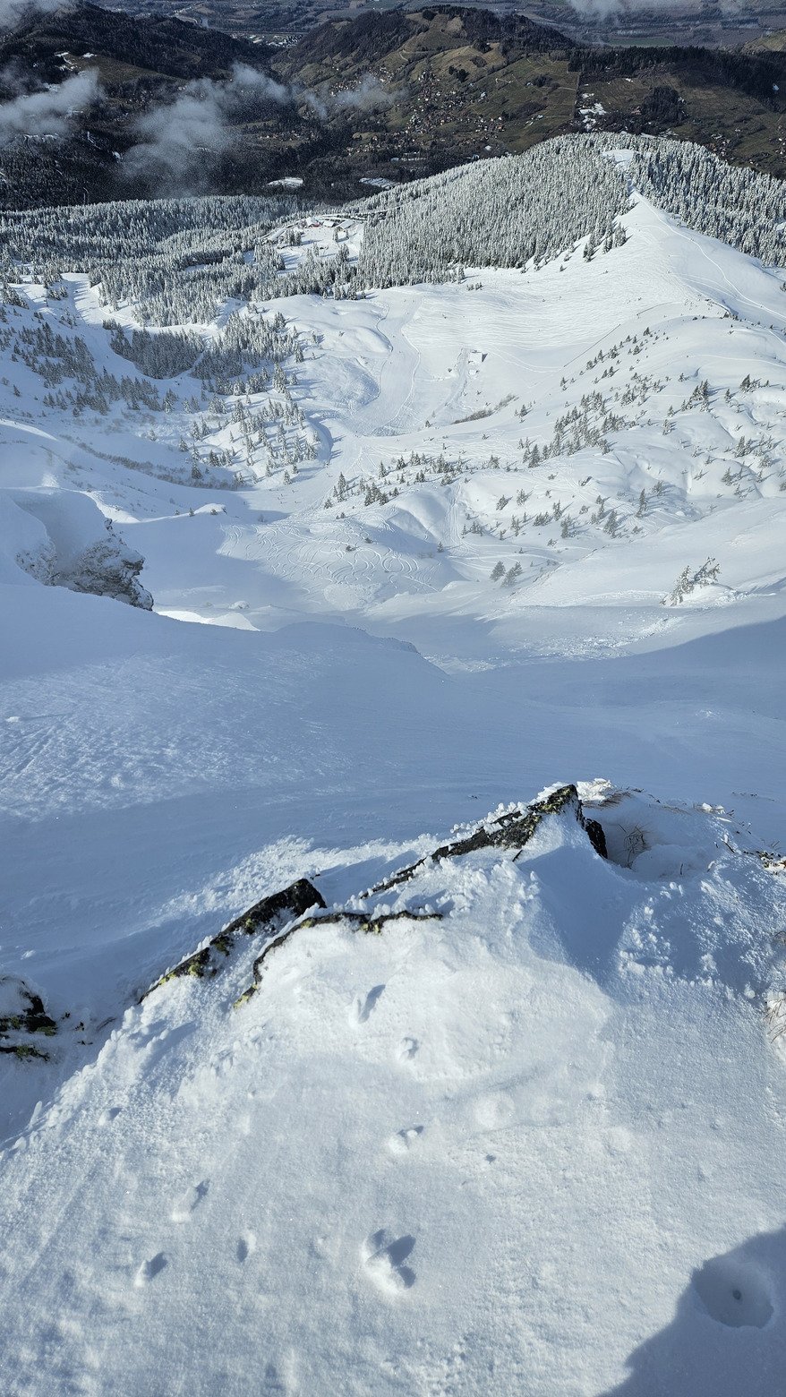 2 personnes devant moi (merci pour la trace) et 2 personnes sans équipement qui ont traversé depuis le couloir, bref ça sent quand même bon y'aura pas beaucoup de traces. D'en haut vision globale. Tout ce qui est au dessus de 2100 a lâché. Toutes la combe de la jasse, la face nord, les valons en intégralité... Bon c'était prévisible mais c’est impressionnant quand même !