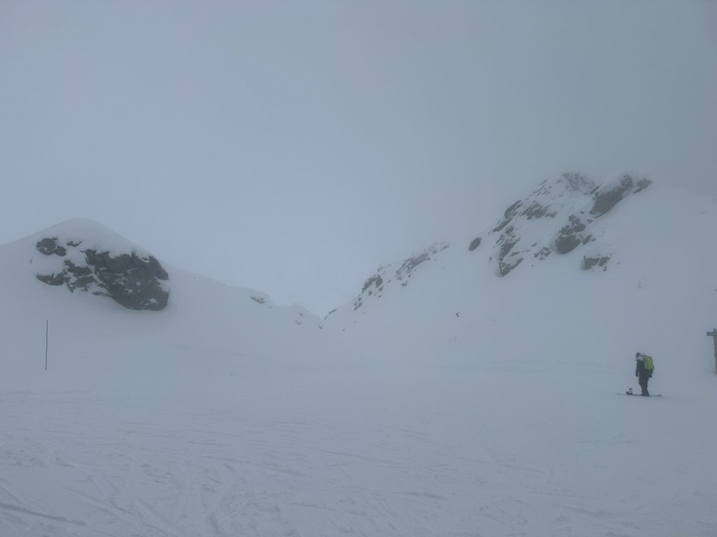 La neige... eh bien elle est pourrie du haut en bas. Certes, c'est le début de saison, on est morts de faim, alors on profite malgré tout de cette soupe parfois croutée. Si on regarde de très loin, ça ressemble à de la fraîche et ça se skie pas si mal.
