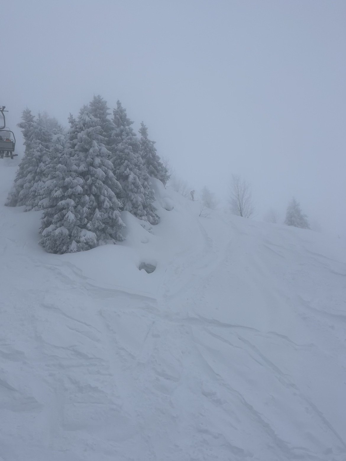 Un petit peu mitigée sur cette journée. Nous arrivons tôt, et pas grand monde à 8h30 au portillon du chamois. Nous sommes juste derrière NitroJere. Trop contente de voir un skipasseur en vrai;) Les hostilités commencent à 9h30. On entend le PIDA. En Haut du Chamois, pas de visibilité, on décide de faire du sapin côté combe Bédina. Aie, le fond est dur sous ces 20cm de poudre, ça part bien dans les pentes un peu raide, prudence... Bédina, damée avec 5 10 cm de poudre, c'est un régal, j'ai jamais était aussi vite. 2-3 rotations et on bascule sous le grand cerf. J'ai rarement vu autant de monde sur les liaisons. Sous le grand cerf, pas top, poudre sur le haut dans les coulés déjà déclenchées, glace, cartonnée sur la fin et tout ça dans le brouillard. Direction Oursière, pas mal le HP, encore de quoi tracer. Oursière est fermé, à priori, il y a eu une avalanche dans les vallons avec 1 ou 2 victimes. On remonte pour faire les plagnes, côté gauche, on trouve de la bonne neige avec un fond toujours dur mais zéro visibilité. J'entends des anglais qui me suivent "fucking Fog". En haut du grand cerf, je m'aperçois que l'on est passé en risque 4, alors que nous étions en 3 ce matin.