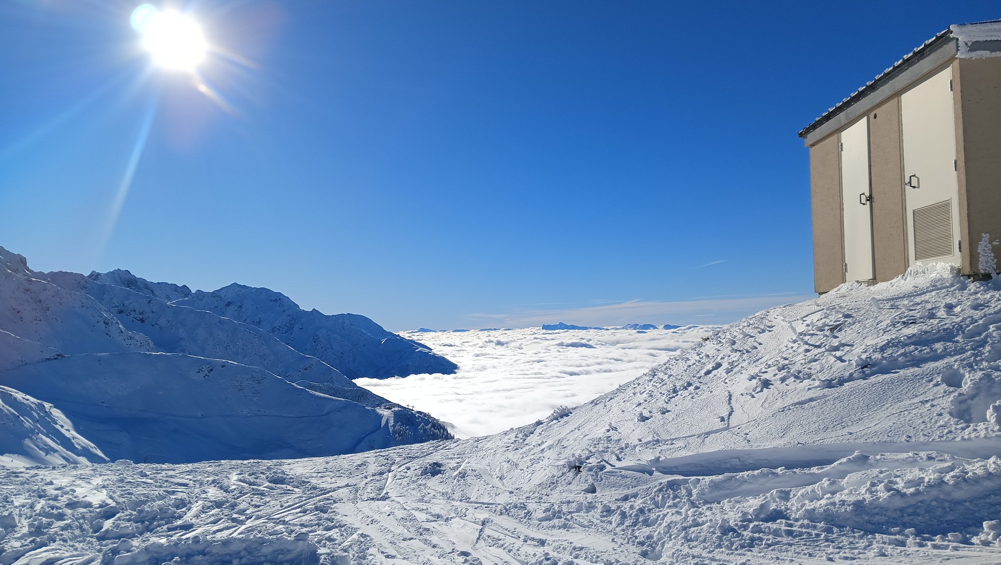 On a donc de la poudre plus ou moins profonde, plus ou moins travaillée par le vent et les éléments... Sous un magnifique soleil et sur une mer de nuages.