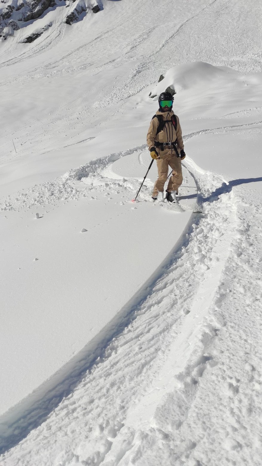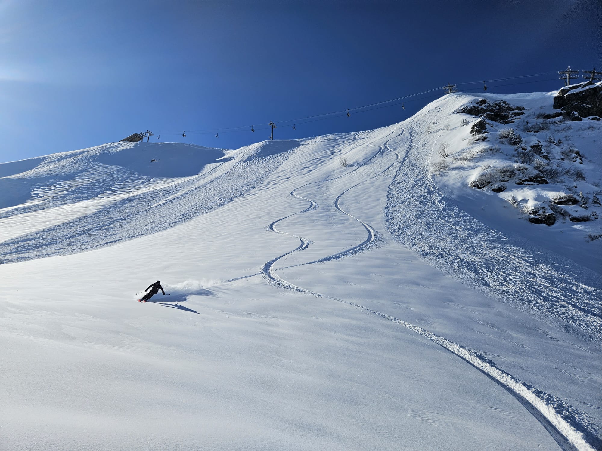 ✅ Et c'était bien cool, parce que pas de ruée vers l'or blanc ce matin. Ça élimine pas mal de facteurs humains ; j'ai trop souvent vu les riders courir vers des runs trop forts, trop engagés, juste pour le plaisir de la première trace avant les autres. Là, on a eu le temps d'y aller à notre rythme, en ridant safe.
