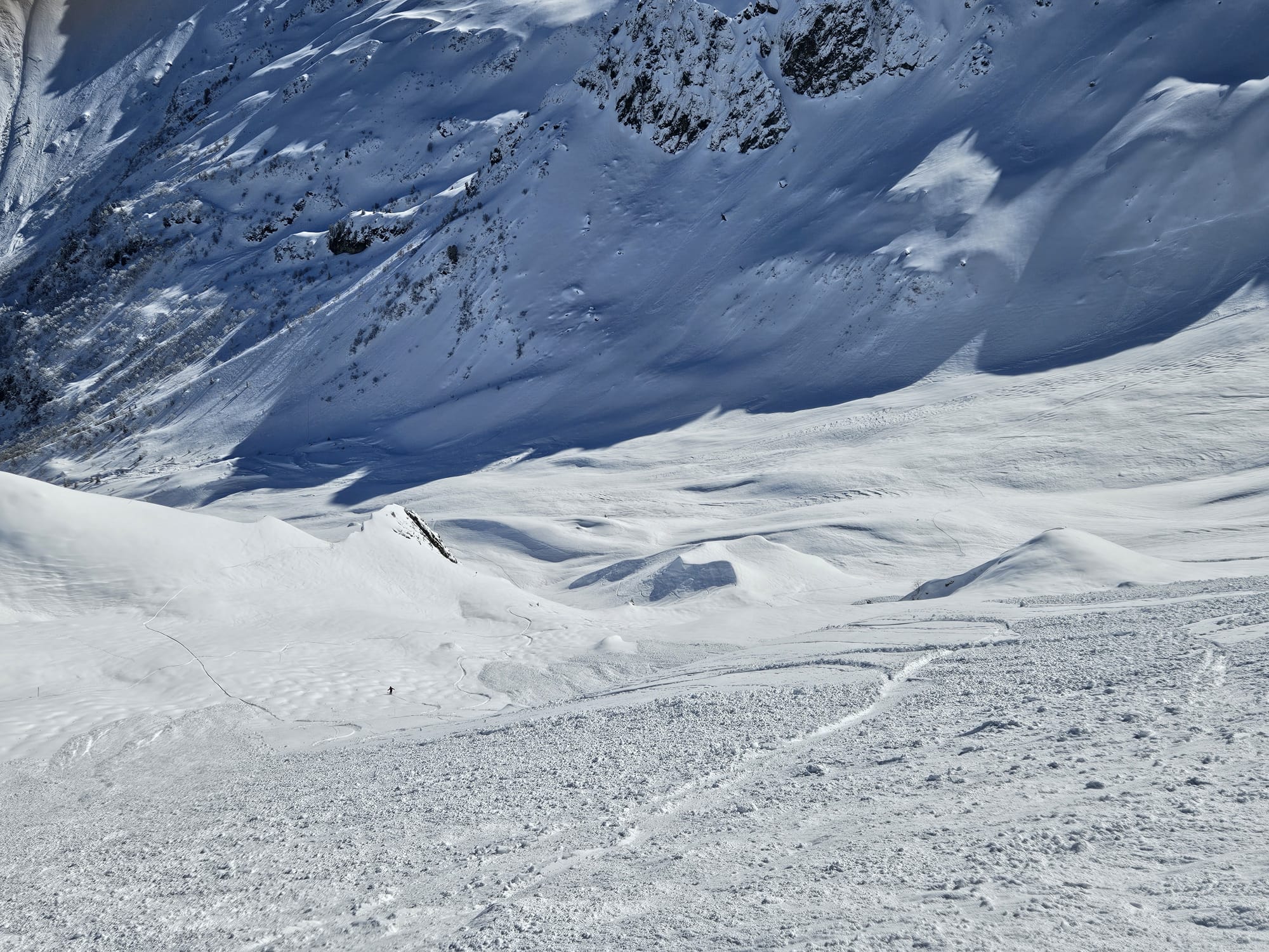 ❌ D'autant plus que, en mars, beaucoup de faces chauffent vite. Très vite. J'ai les cuisses en feu quand on tourne autour d'Oursière. Et j'ai fait des rouler-bouler en plongeant dans les Vallons parce que la neige était trop lourde. Beaucoup d'options aux 7 Laux, certes, mais combien dans de la neige qui reste froide ?