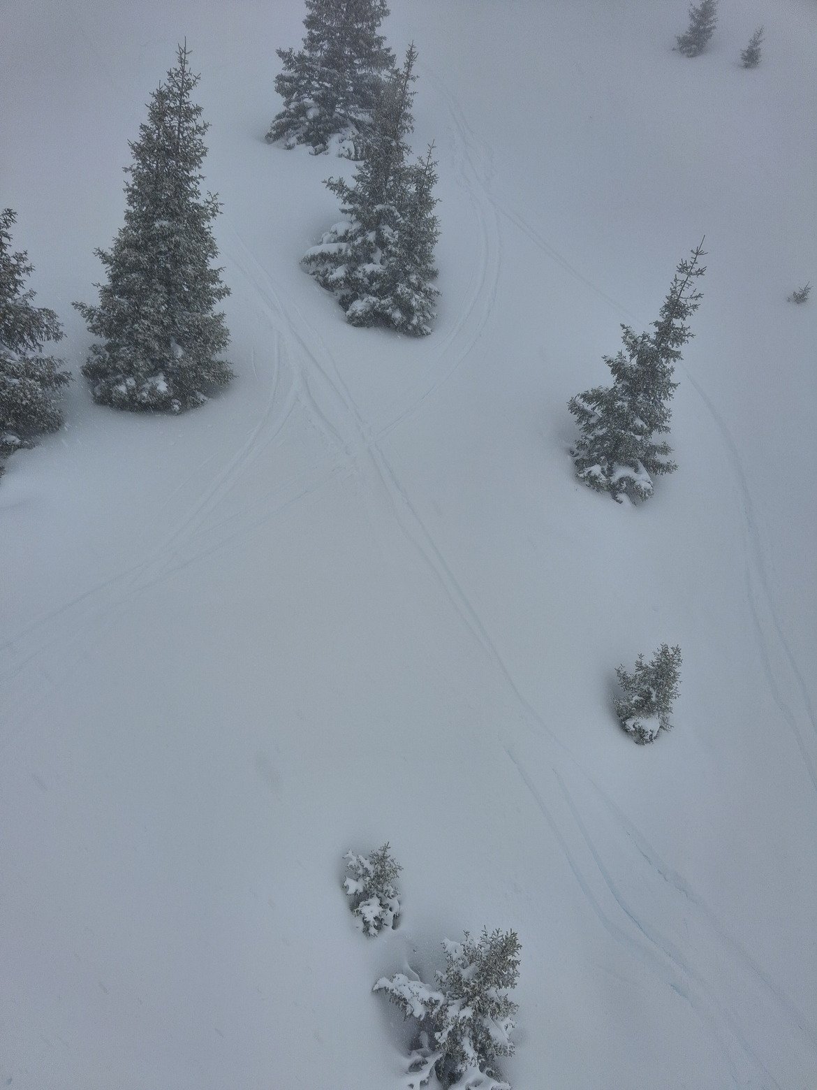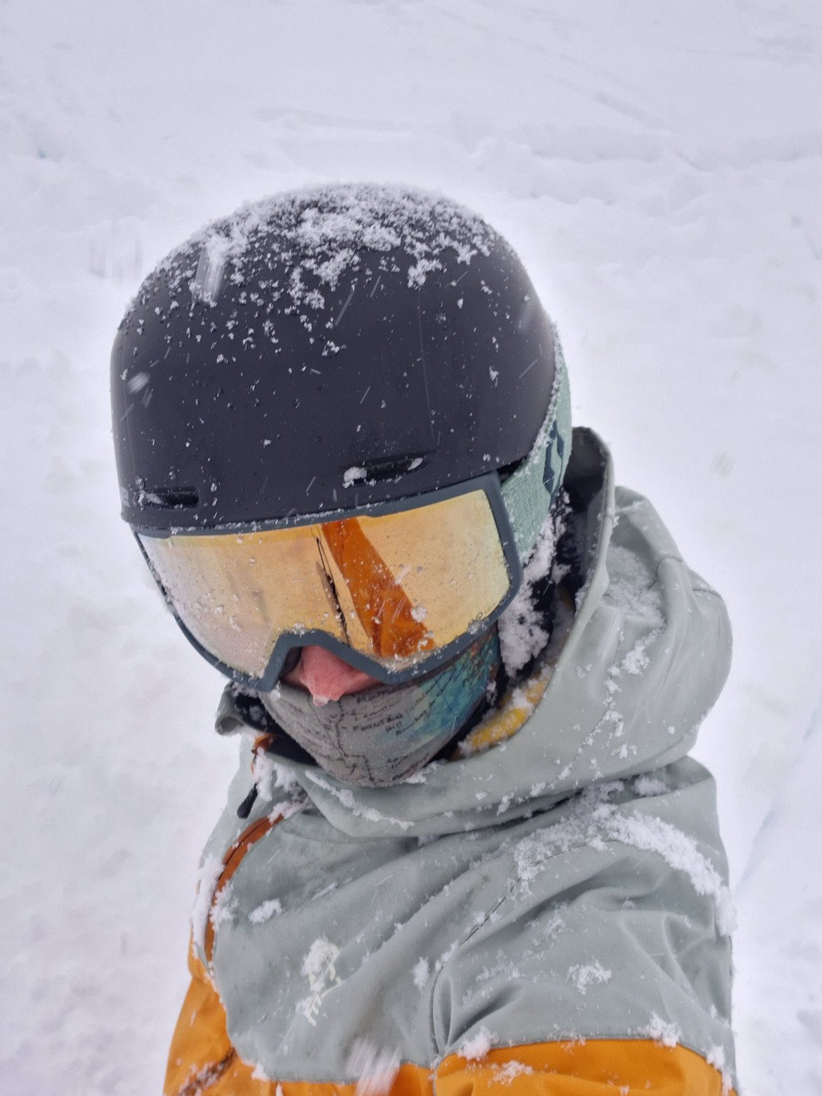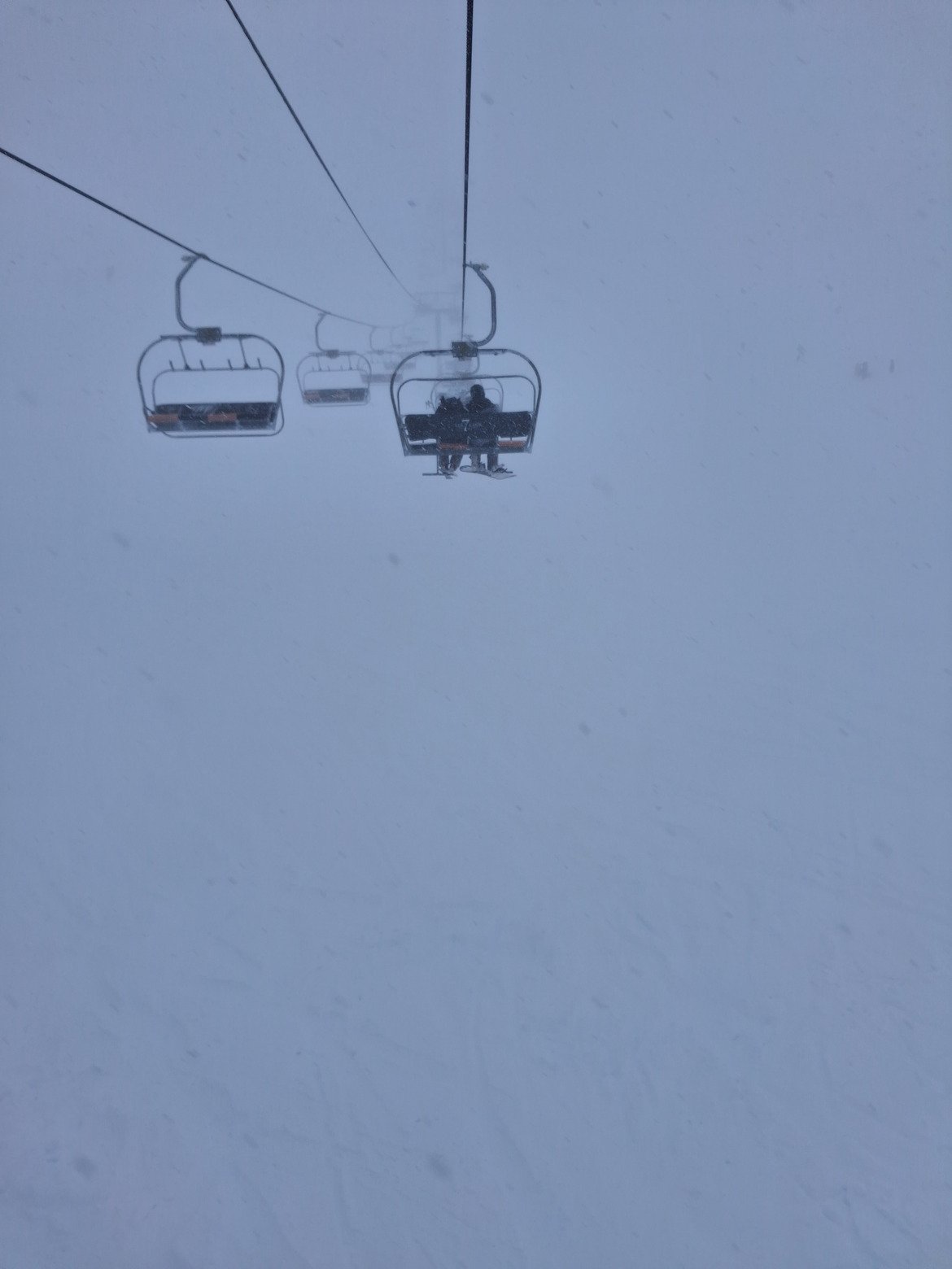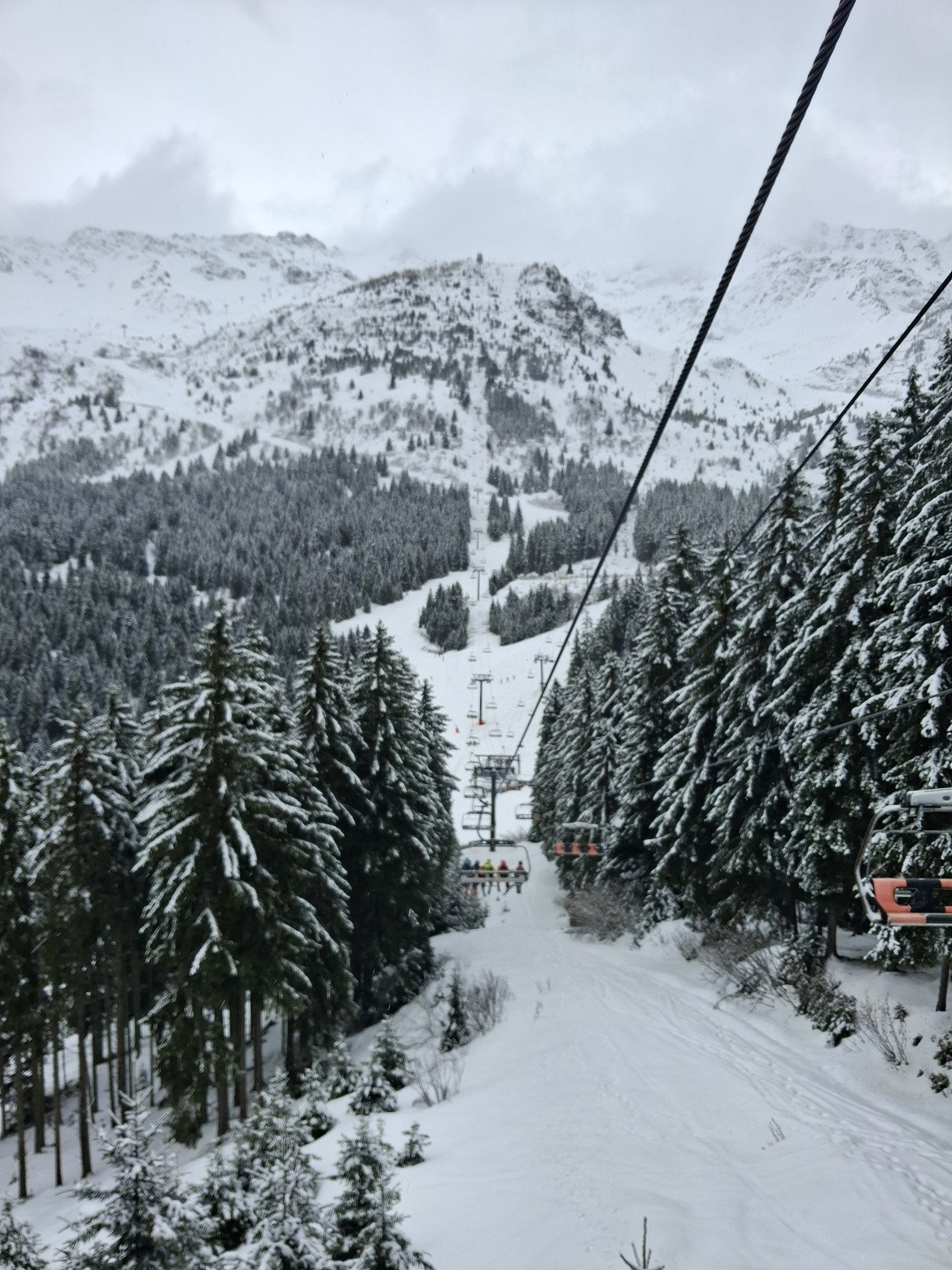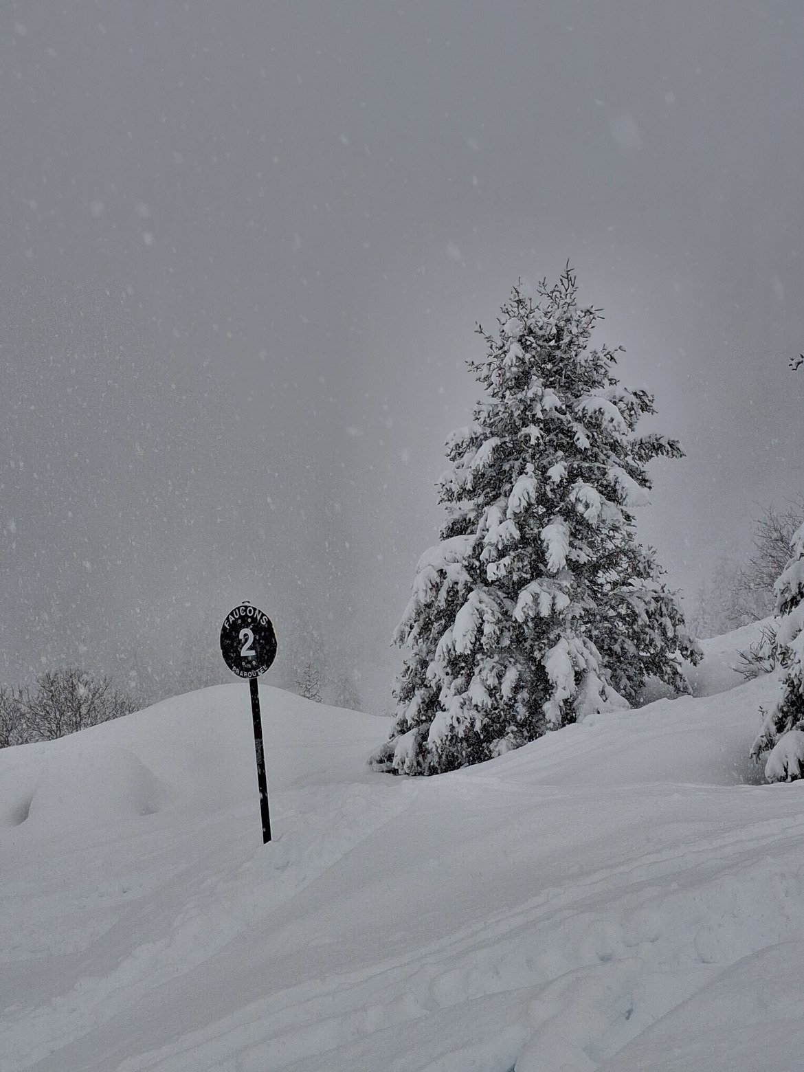 Et quand la visibilite devient nulle, je finis retour station par la piste noire Faucons, ouverte et de la neige jusqu'aux genoux.