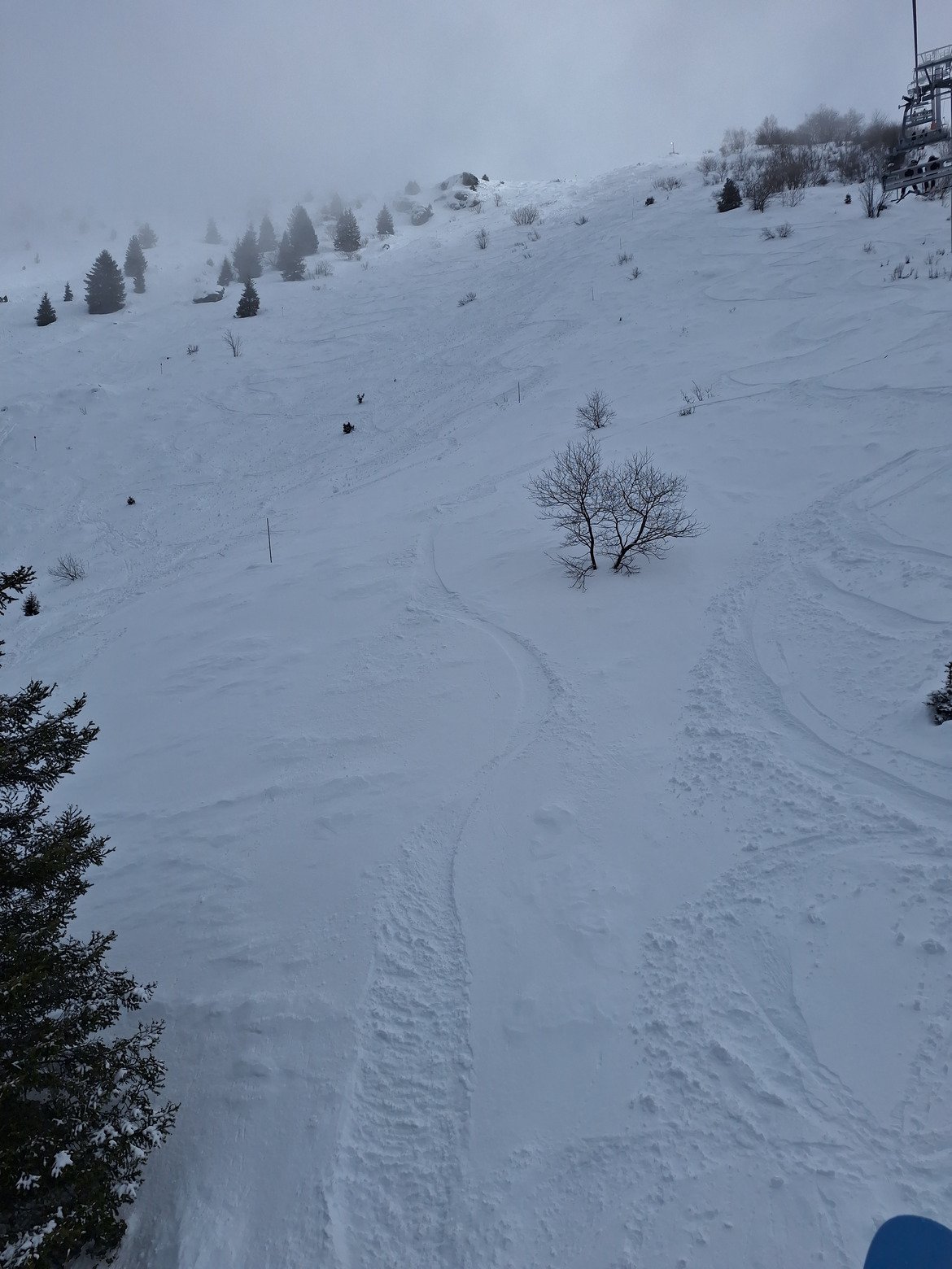 En fin de journée la neige a déjà bien transformé en dessous de 1800m, il fait chaud, damned, ca sent déjà le printemps
