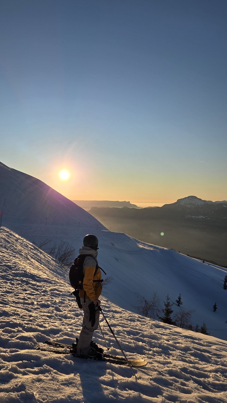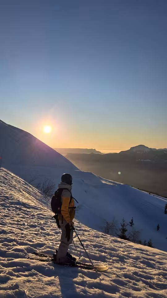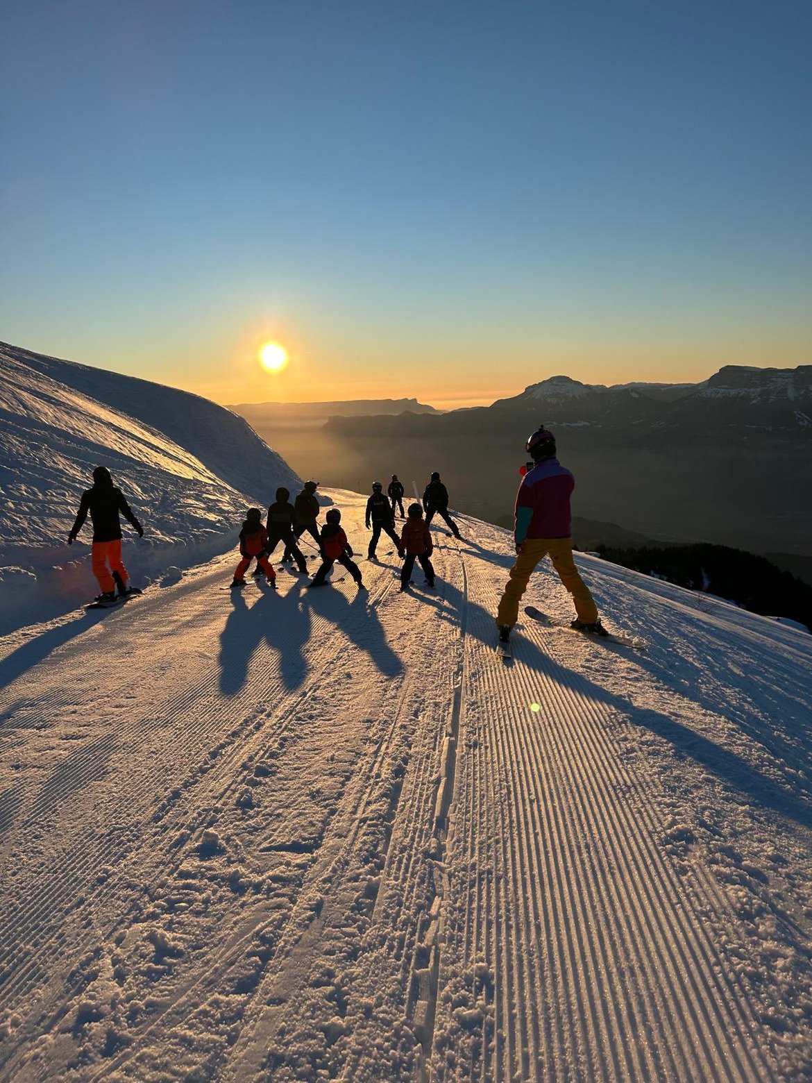 Chocolat chaud, Dj set et descente sur Chanterelle au coucher de soleil, organisée par la station. Super lumière.