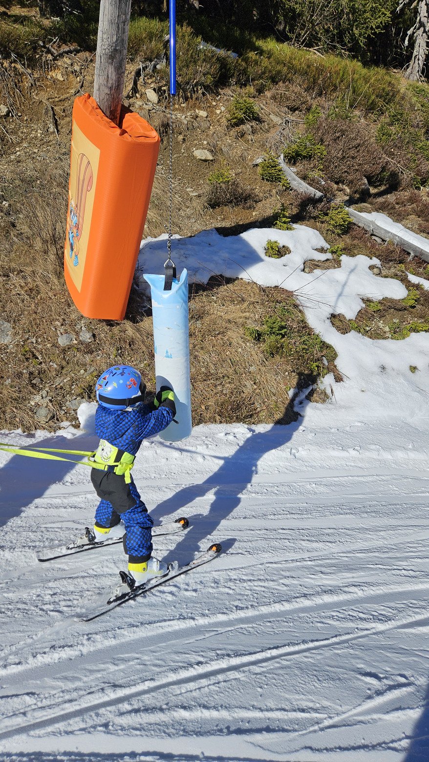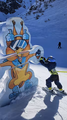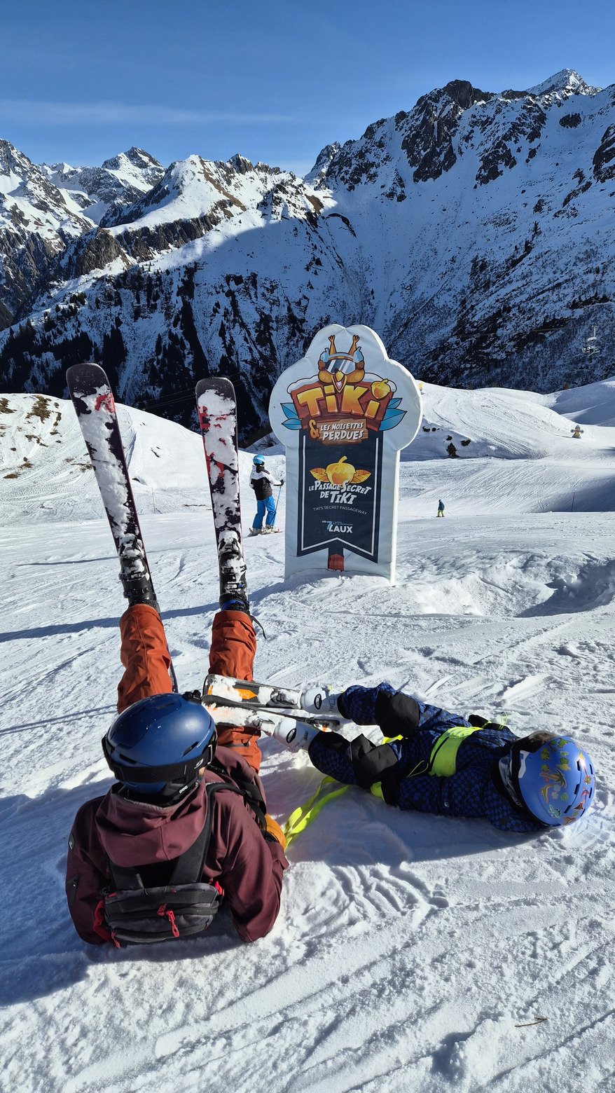 Ah il l'aime toujours autant ce parcours Tiki (tour de la station par les bleu et les vertes normalement pas trop dur mais bon la descente sur oursiere cest toujours pas évident). Les petites "attractions" sont bien toutes en places (taper dans la main de Tiki, taper dans les trucs qui pendouillent, les tunnels sur la verte ...) et ça le drive bien pour continuer surtout quand il est fatigué.