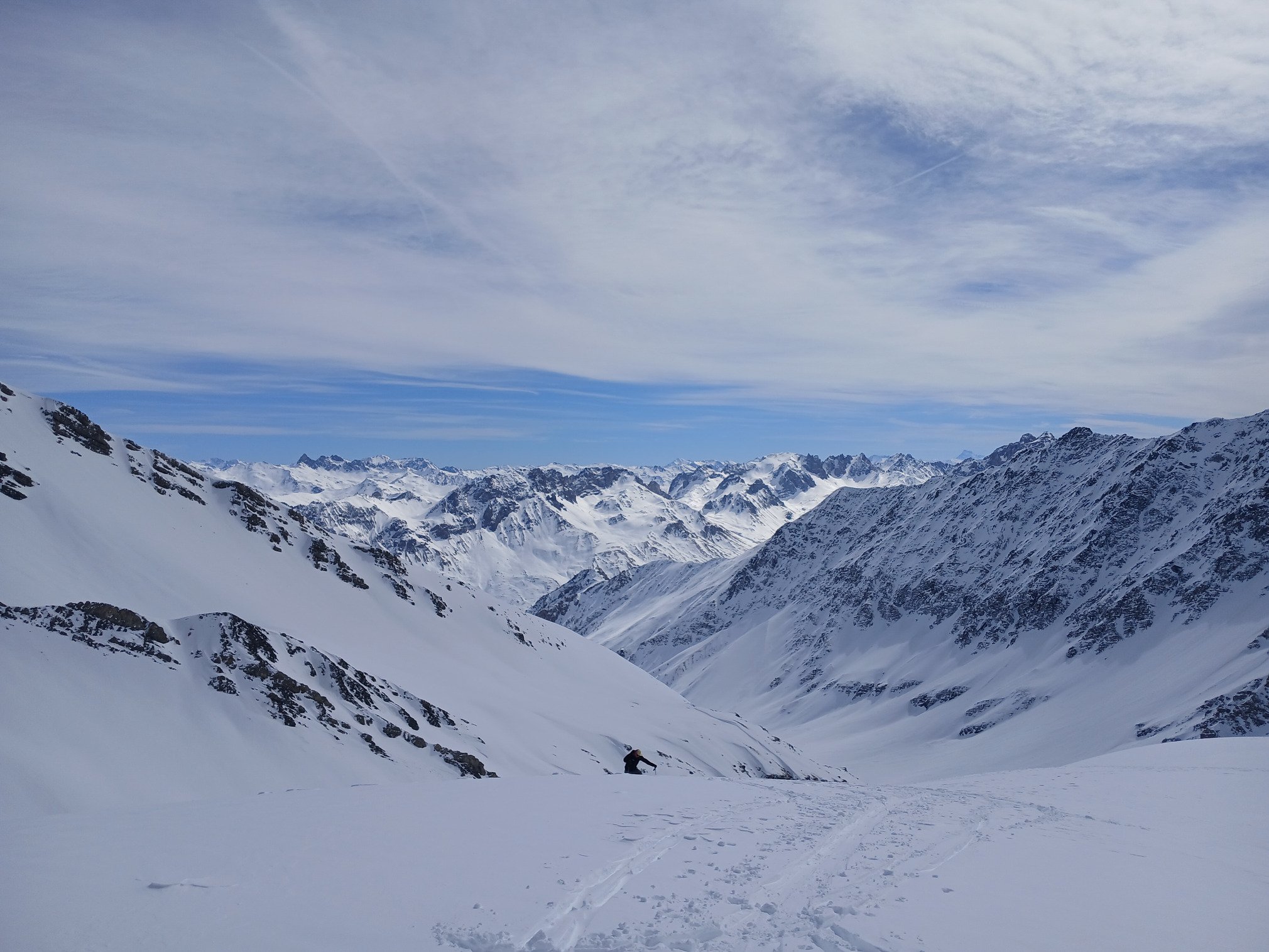 Le lendemain, montée au col des aiguilles par le long vallon au dessus du refuge. Le soleil est au rendez-vous, la neige excellente, et la vue au sommet sur les grandes rousses est merveilleuse. Notre guide sait nous montrer les versants à skier, à quelques mètres près on passe d'une vilaine croûte à une chouette neige fraîche. Les explications qui vont avec me permettent de comprendre énormément de choses, ça vaut vraiment le coup.