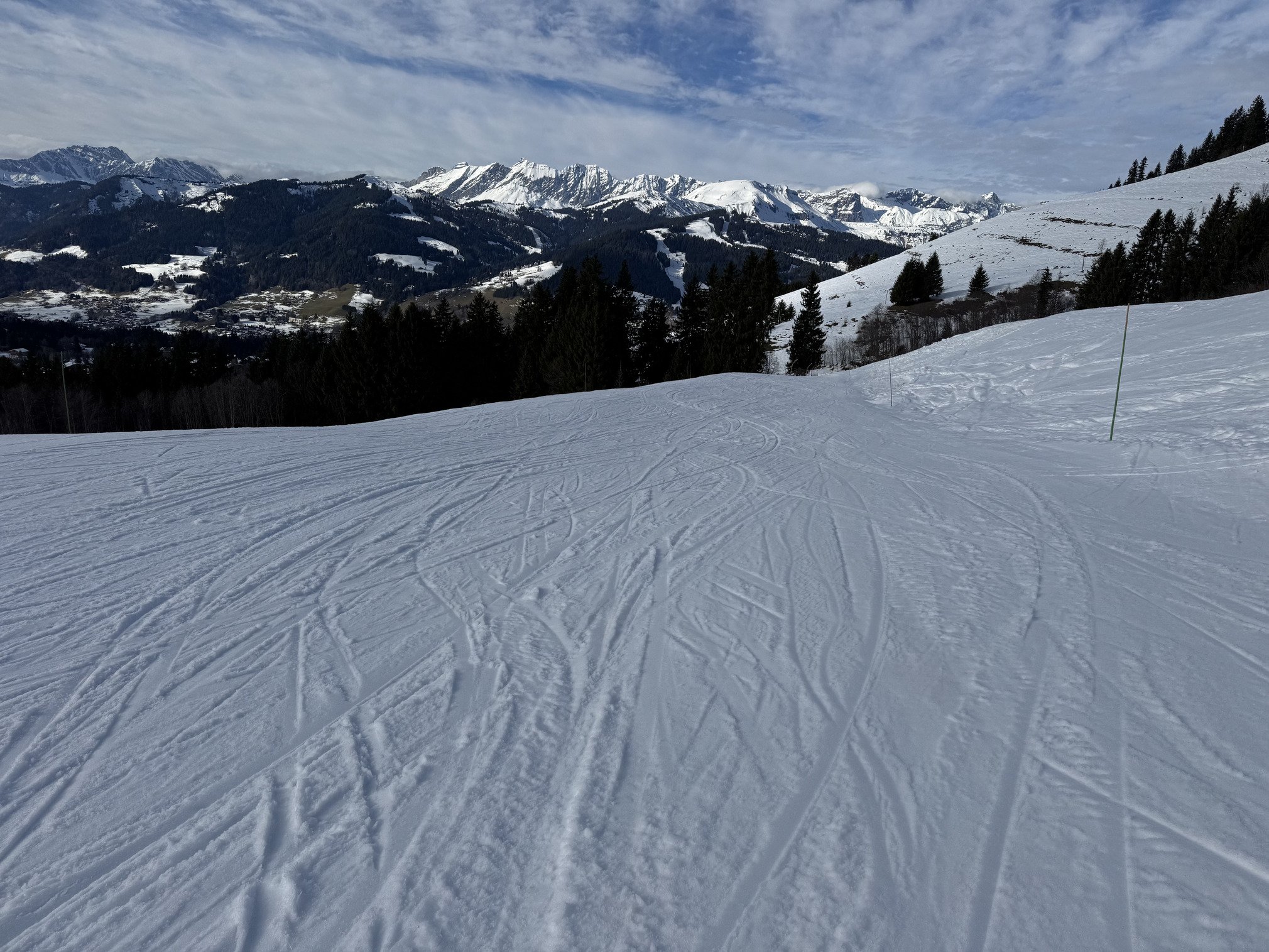 1 piste rouge, 2 bleues et de la verte d’ouvertes. Quand je suis arrivée, un peu après midi, la soupe commençait en milieu de pistes. Puis elle est remontée assez vite jusqu’au sommet du Mont d’arbois.