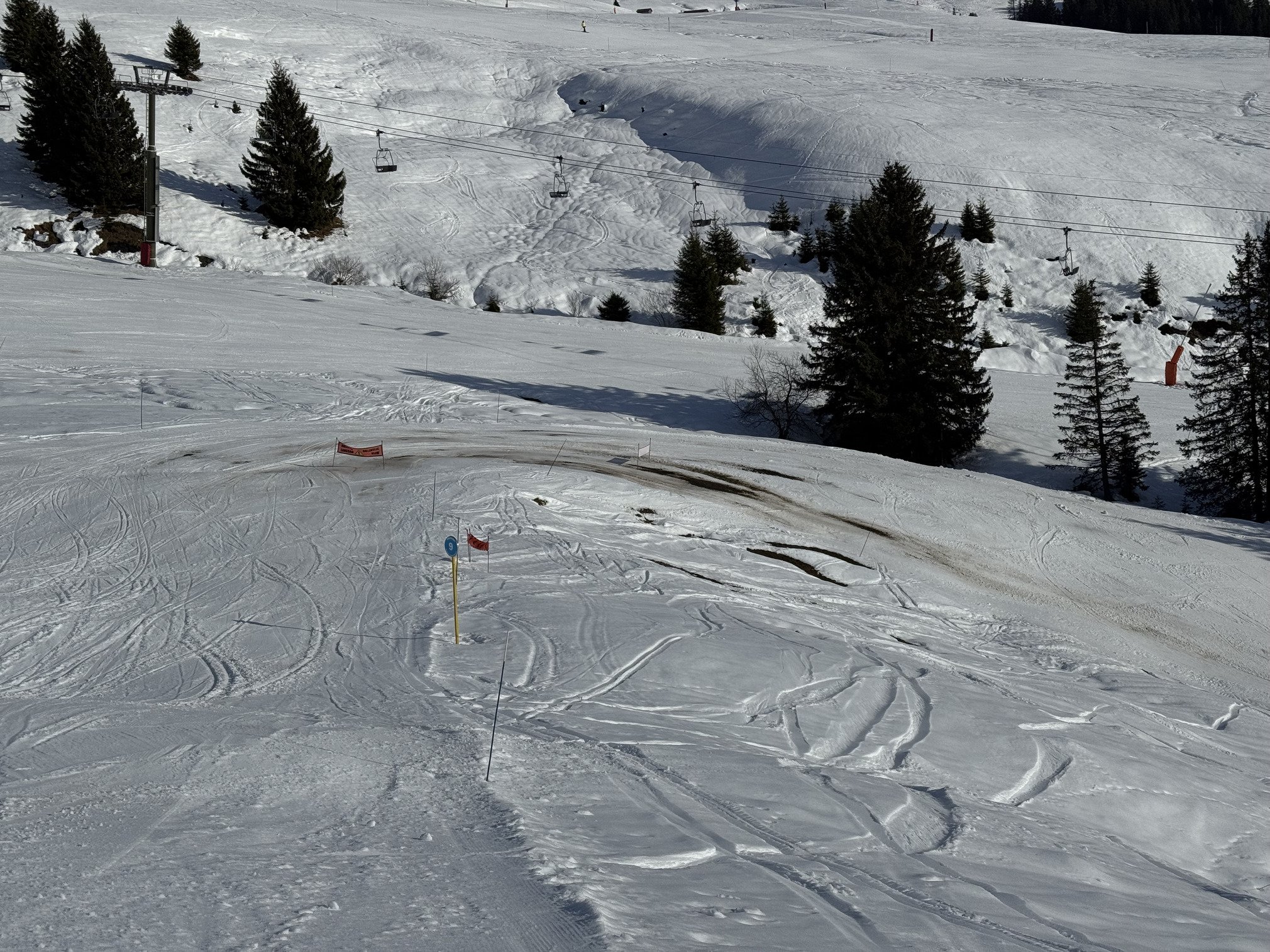 J’ai testé la rouge mais elle est plus à l’ombre, une première partie encore trop en neige dur avec des boulettes de dameuse et une partie basse trouée par la terre. Rien à faire en hors-piste à cette altitude.