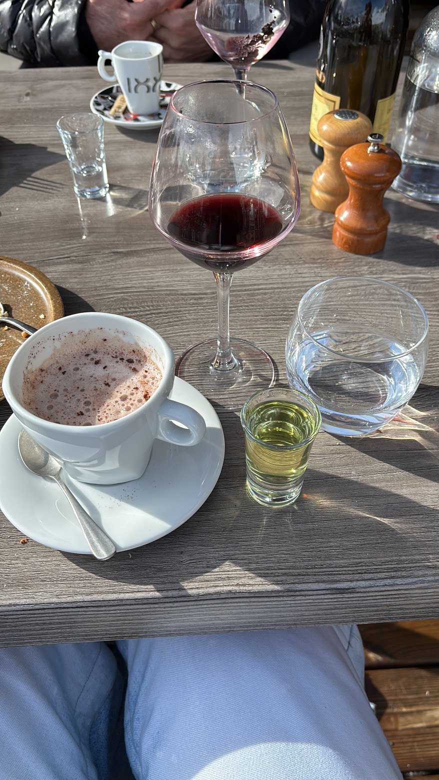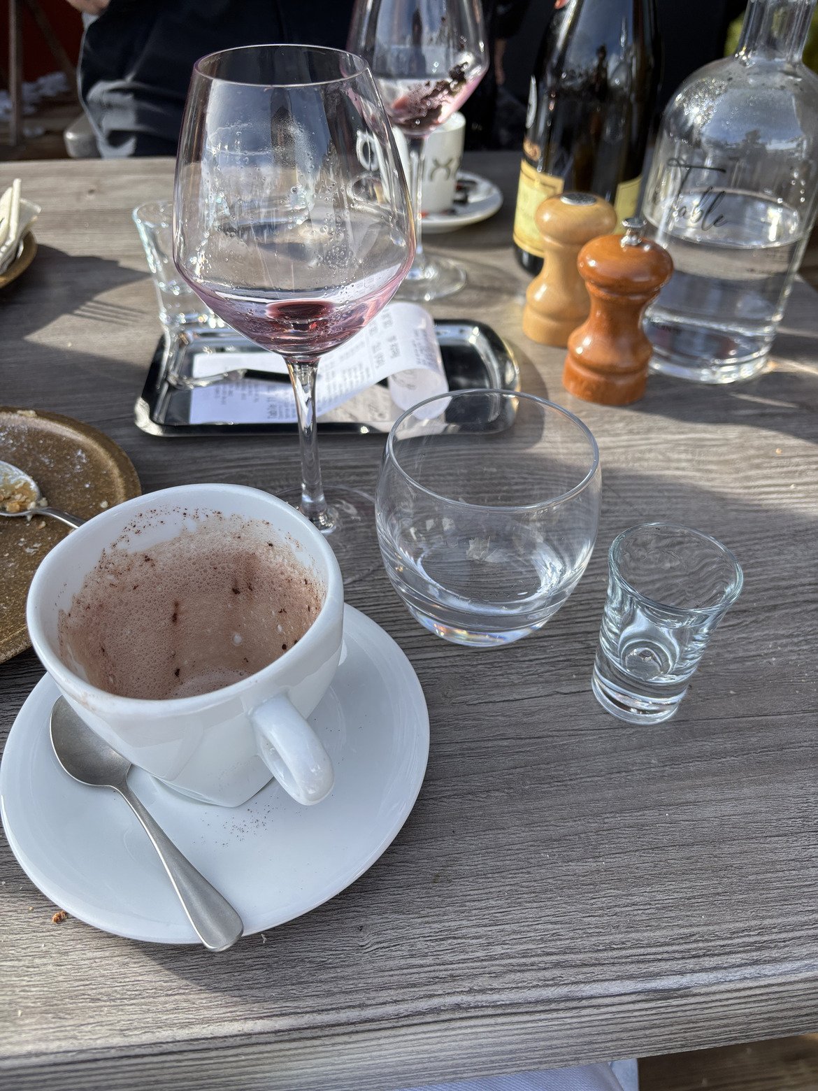 Descente sur Val Thorens par Alpage puis Mont de la Chambre et Montaulever, après le pont je m’arrête à droite au restaurant des hameaux du Kashmir: carte épurée, prix acceptables pour Val Thorens et accueil au top, je reviendrai…seul problème, je ne sais plus quel verre boire, du coup je les bois tous!