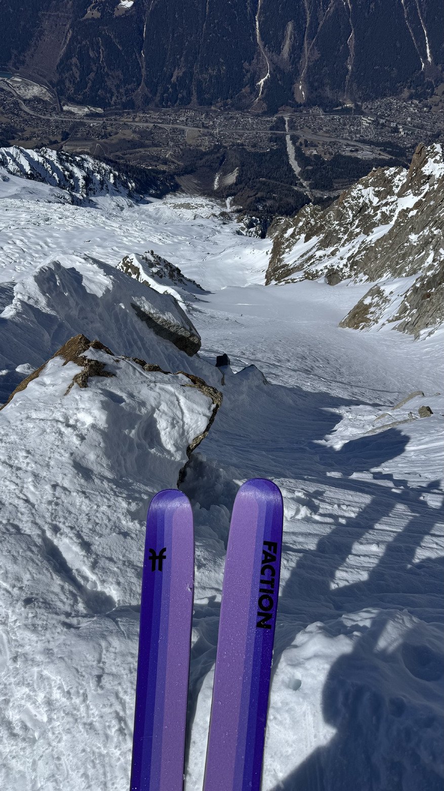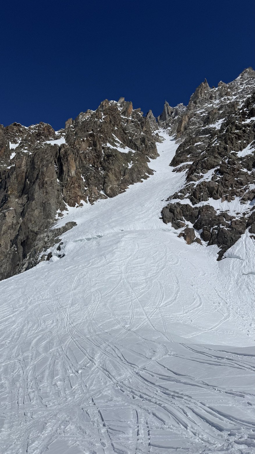 Pas de réservations de bennes, on c’est donc pointé à l’ouverture pour pouvoir monter. On a commencé par le plus connu: le couloir des comisques. Avec deux rappels de 30m, le premier est facilement skiable. Un peu tôt pour skier W mais il faut tenir le timing pour enchaîner les deux. La neige était donc bien dur, le couloir a été bien skié il restait très peu de neige « fraîche ». Par contre c’était excellent sur le glacier ! Il était difficile de ne pas enchaîné les virages mais on a essayer de rester le plus haut possible dans la traversée pour rentrer au plan sans trop d’effort.