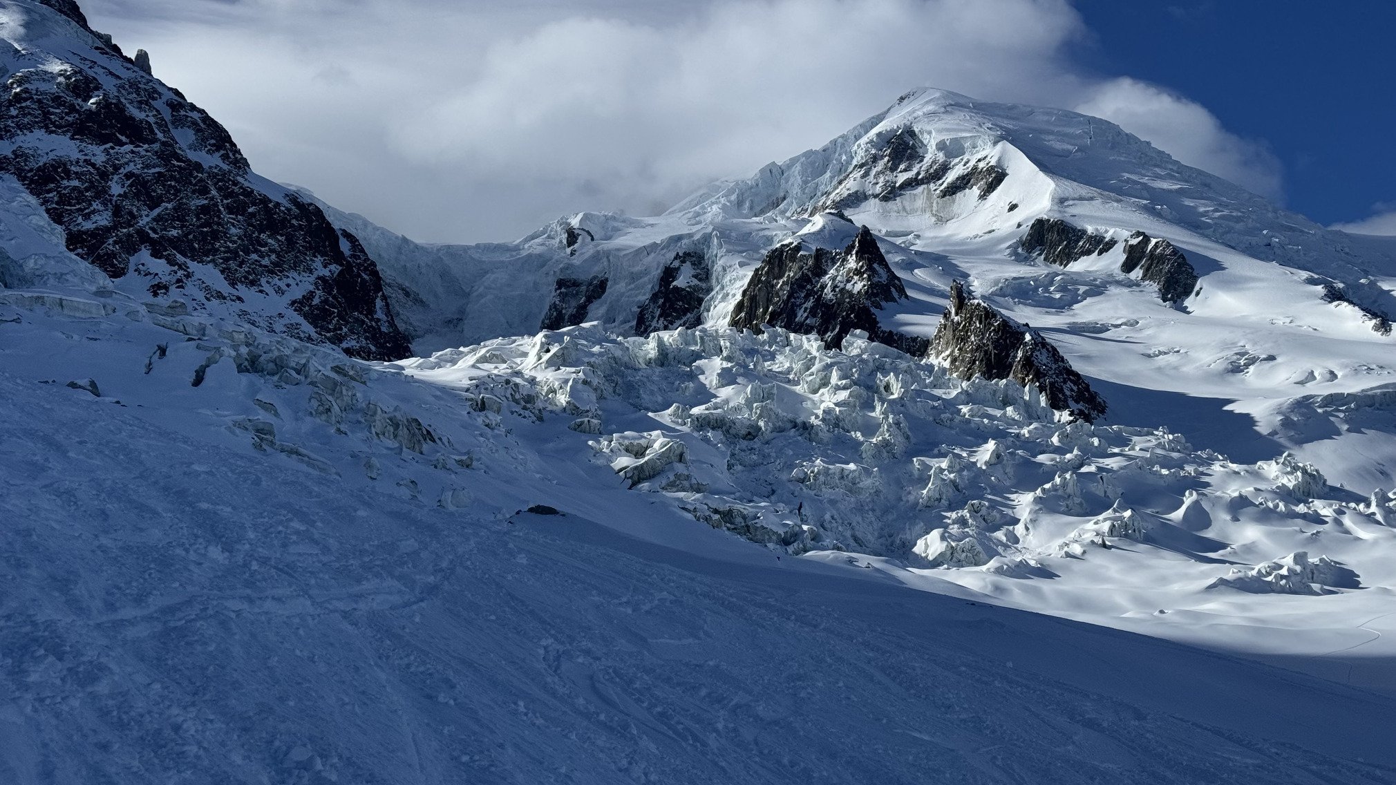 Au final avec le soleil de cette semaine la moraine a été bien décaper. Elle passe soit tout en haut, soit tout en bas. Avec un snowboard c’est compliqué de passer par haut donc pour la première on a pris l’option basse et après 2 peautage/depeautage on a pu rejoindre la gare intermédiaire.
