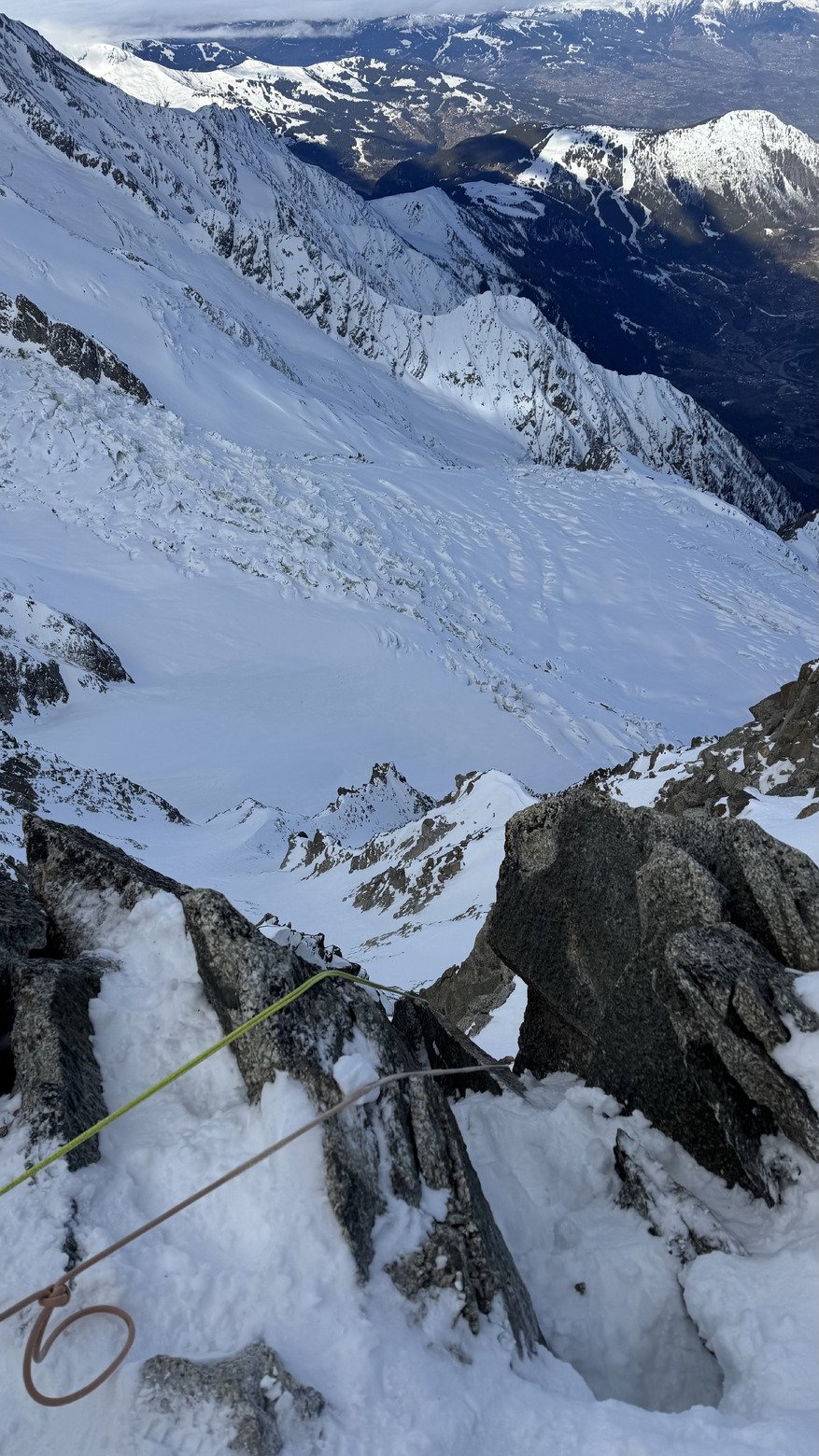 En therme de fréquentation: personne dans les cosmiques à cet horaire. Un groupe bloqué dans le rappel du rond (relais trop haut: cordes trop courtes 2x50), puis un groupe en pause repas au changement de couloir. Bref une journée ensoleillée, étonnamment seuls dans ces classiques chamoniards.
