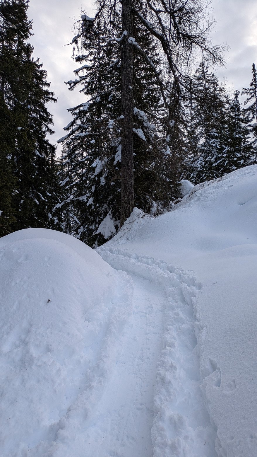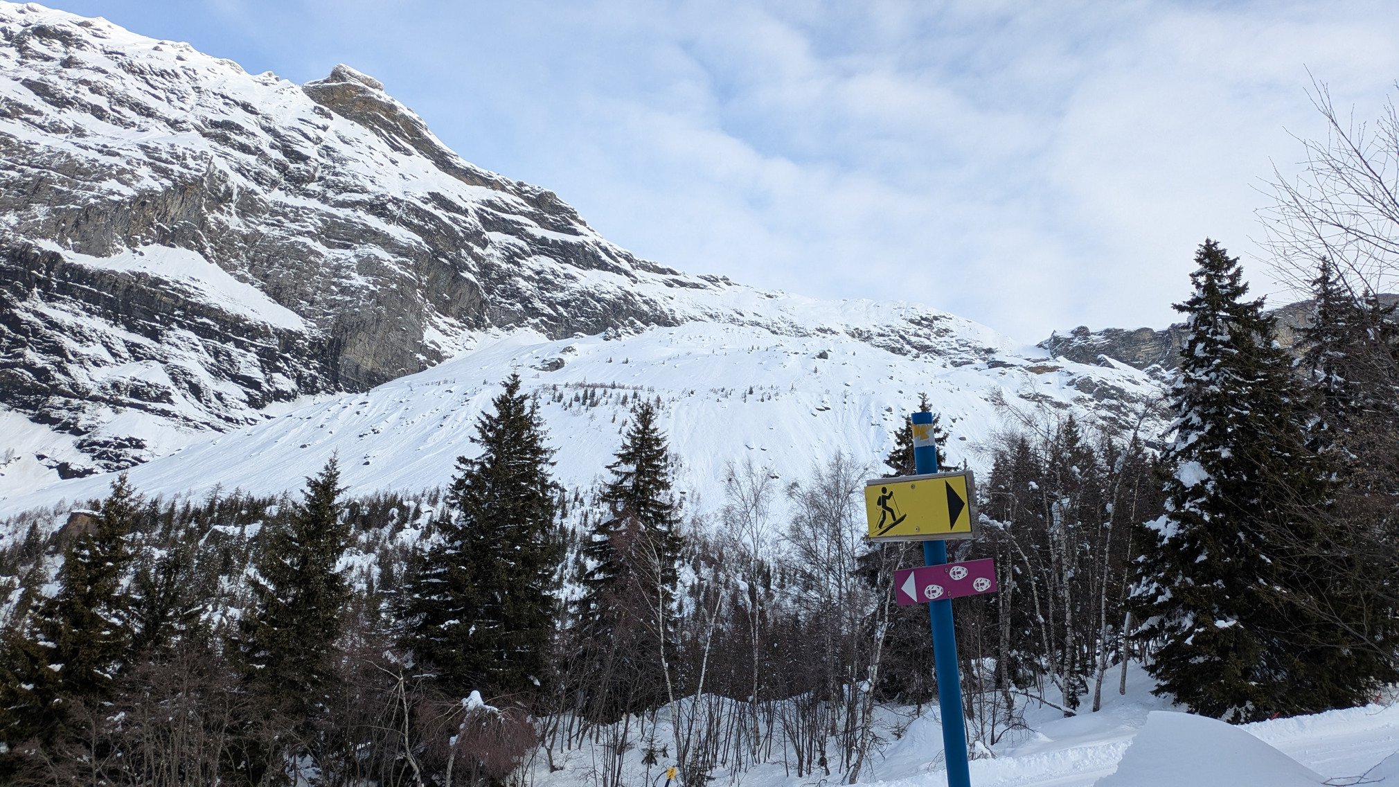 Quelques sangliers en raquettes la veille ont laissé quelques trous dans la trace, qui a un peu gelée en forêt mais ça se monte tranquillement entre les sapins. Redescente par les pistes, agréablement damées mais on sent que c'est gorgé d'eau notamment en dehors, souple mais lourd donc.