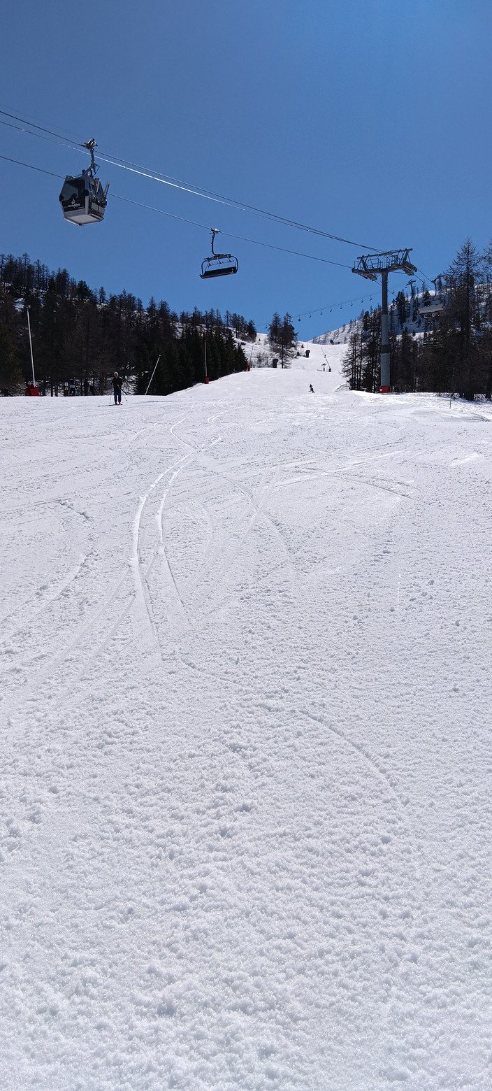 On a pu faire du très bon ski sur le stade de slalom du Prarial vers 15h (damage relativement vierge de traces, décaillage sur 5 cm), sur la rouge du Rocher de l'Aigle 30 minutes plus tôt (quelques paquets de neige mais c'était pas Verdun non plus, et on arrivait encore un peu à sentir le fond dur), la rouge Sources sur les Gondrans (vers 14h) ou l'Envers (l'une des rouges du TS Prarial) vers 15h30, en dernière descente.