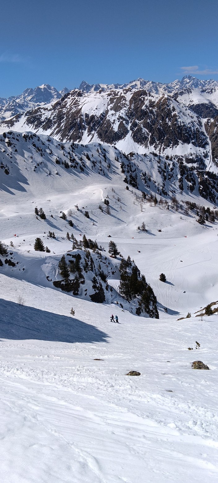 A l'inverse, la noire Rhodos était déjà ultra collante vers 11h30, comme globalement à peu près tous les hors pistes. Allez, on a quand même sauvé les meubles sur l'un des couloirs de l'Aigle vers 14h15, mais c'était pas transcendant : un peu trop mou au soleil, trop dur et traffolé à l'ombre. En restant au soleil et en visant plutôt 13h, ça aurait sans doute été mieux.