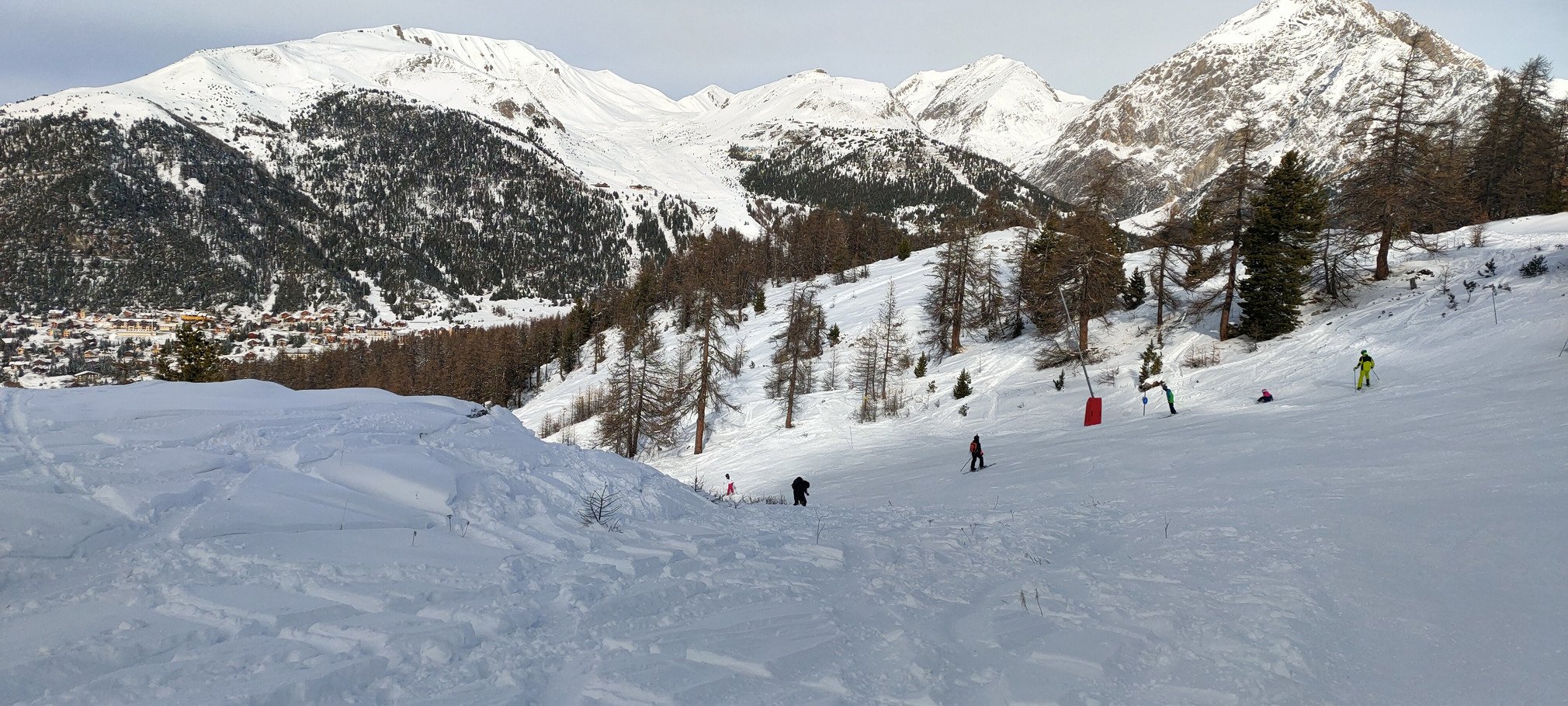 Il n'empêche, on se dit que la meilleure solution est quand même d'aller là où il n'y a pas grand monde. En l'occurrence les pistes pas encore ouvertes mais néanmoins praticables, en particulier celles desservies par les TS de Tremplin et Prarial. Dans le détail, il n'y avait pas une trace sur la noire de Tremplin, en bonne poudre légère (environ 30 cm) même s'il faut skier léger car ça manque de sous couche. Sur l'Office, c'est excellent, car ici la sous couche est présente et encore des traces à faire. Sur Mandarine et l'Envers, c'est un peu entre les deux, avec des sections excellentes et d'autres où les cailloux affleurent. On a aussi fait la noire de Brousset, elle aussi fermée mais nickel, et même bien meilleure que généralement grâce à un nombre plus faible de passages.