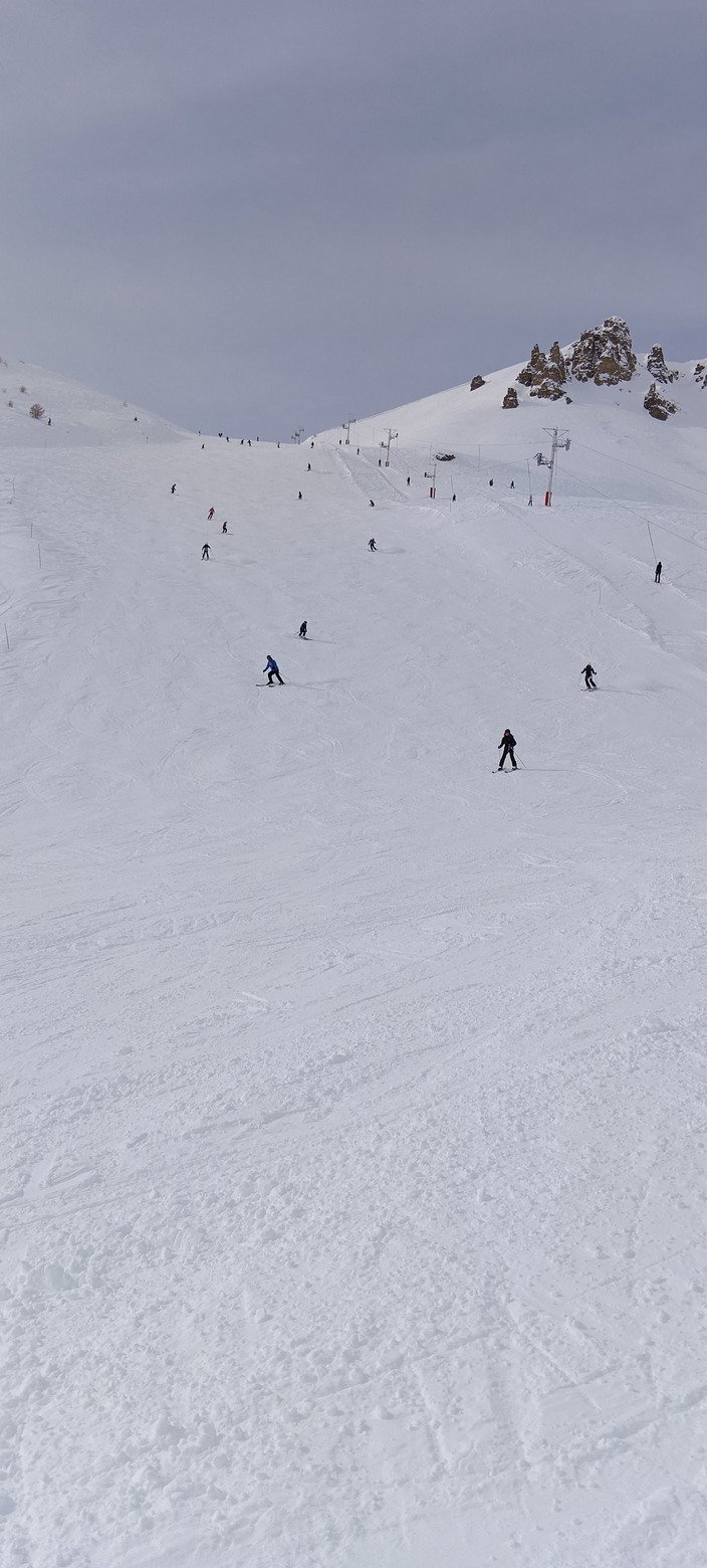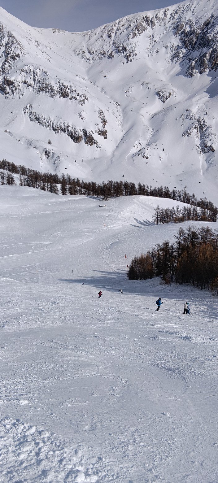 Sinon, niveau neige, c'était encore très bon avec ce qu'il est tombé ces derniers jours. Neige douce sur piste, sans plaques ou quasi (ça pouvait lustrer un peu l'aprem avec les passages, mais ce n'était jamais verglacé). Dans celles que j'ai faites, les meilleures étaient les pistes sans canons (les 2 noires de Rocher Rouge et celle du TK Fourneous, la rouge Office).