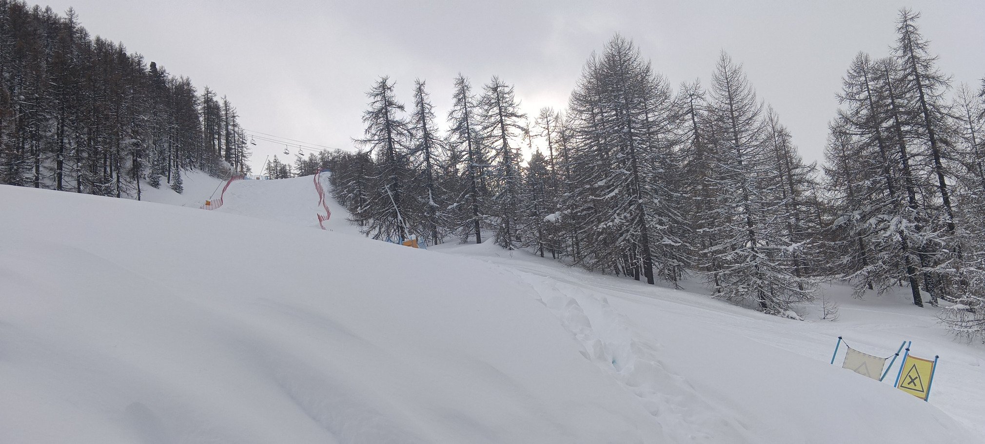 On se serait cru à Whistler ou au Japon, avec une poudreuse abondante et légère. Je serais incapable de quantifier précisément la hauteur de poudre, mais je dirais pas loin d'un mètre. On en avait a minima jusqu'aux genoux, et même plus souvent jusqu'aux cuisses ! C'était tellement épais que lorsque je suis descendu directement sous la ligne du TS Prarial, j'ai bien cru que j'allais toucher les skis des gens sur les sièges avec mon casque 😱