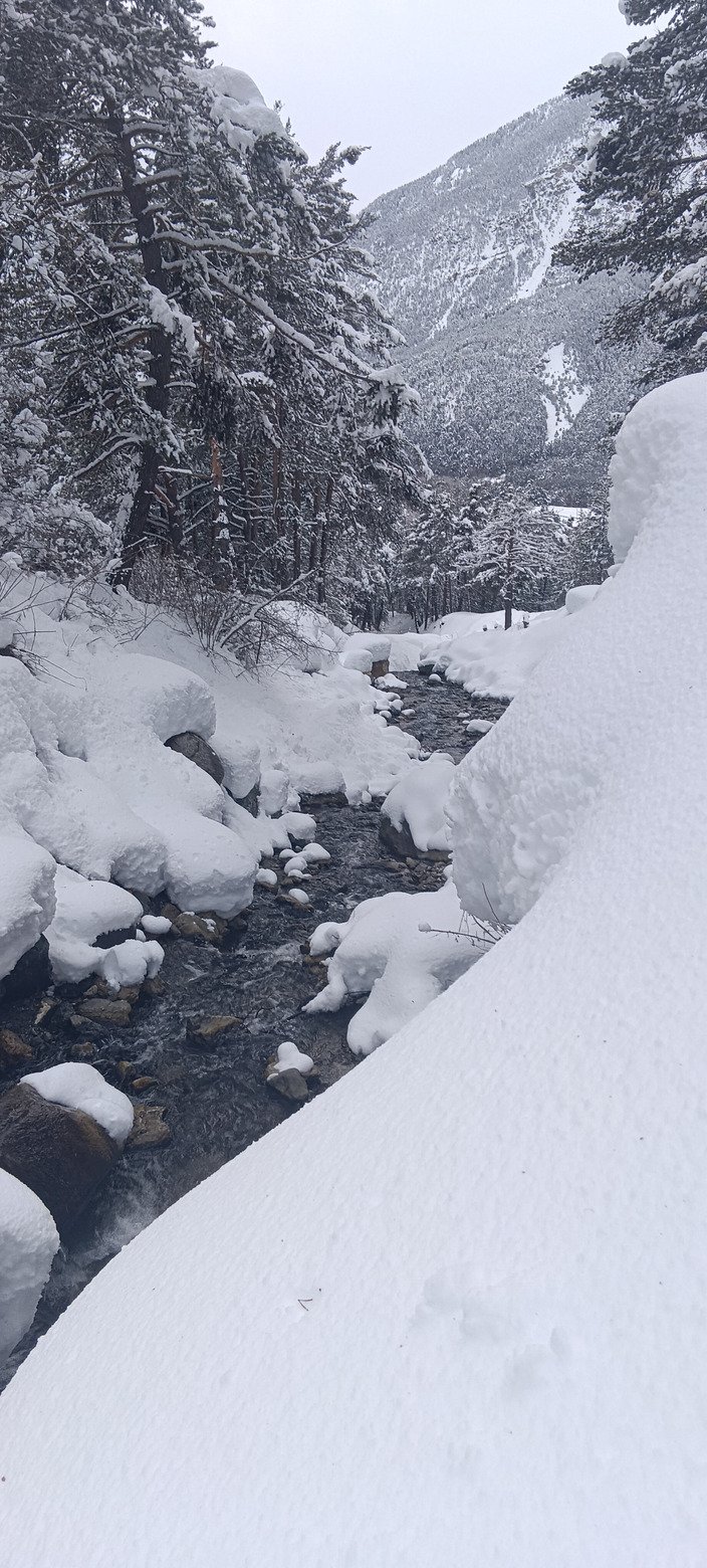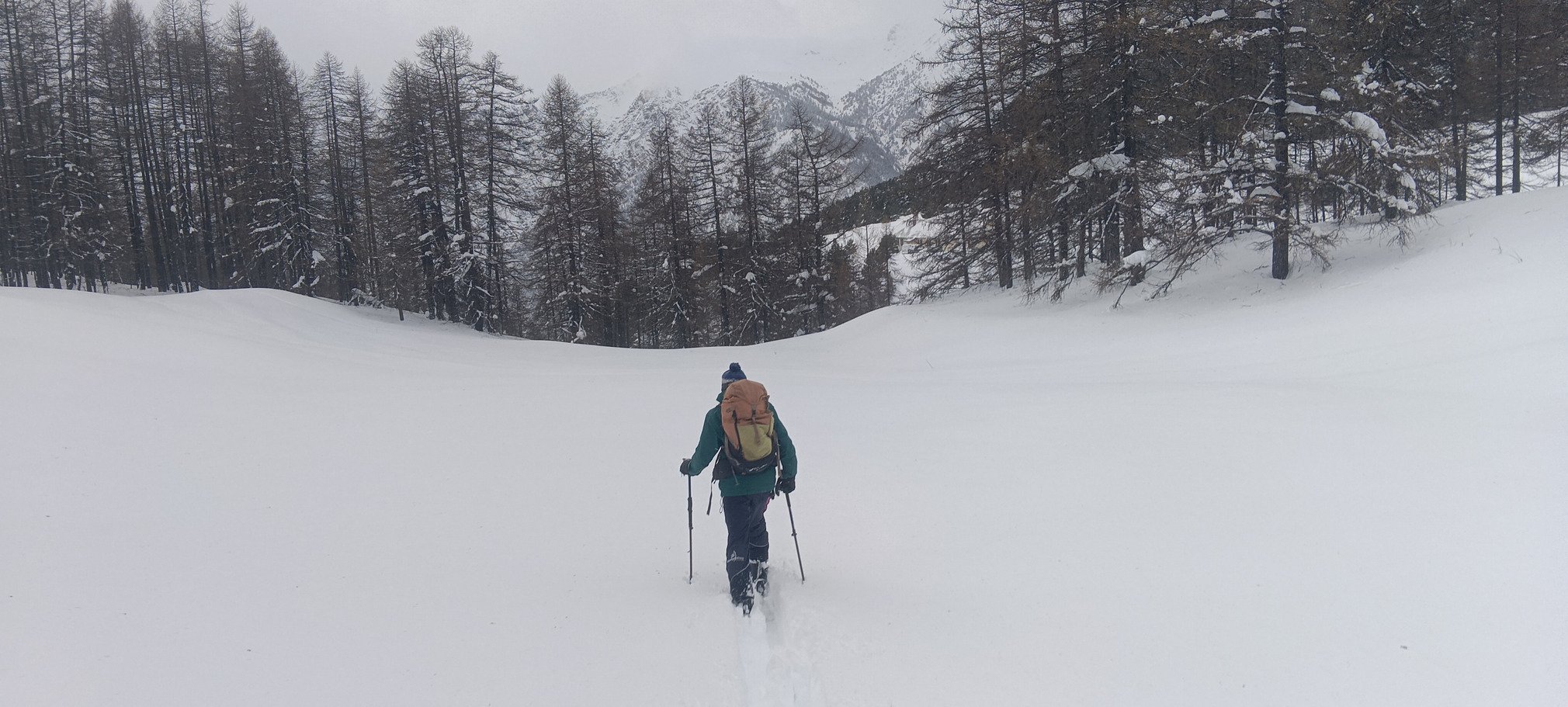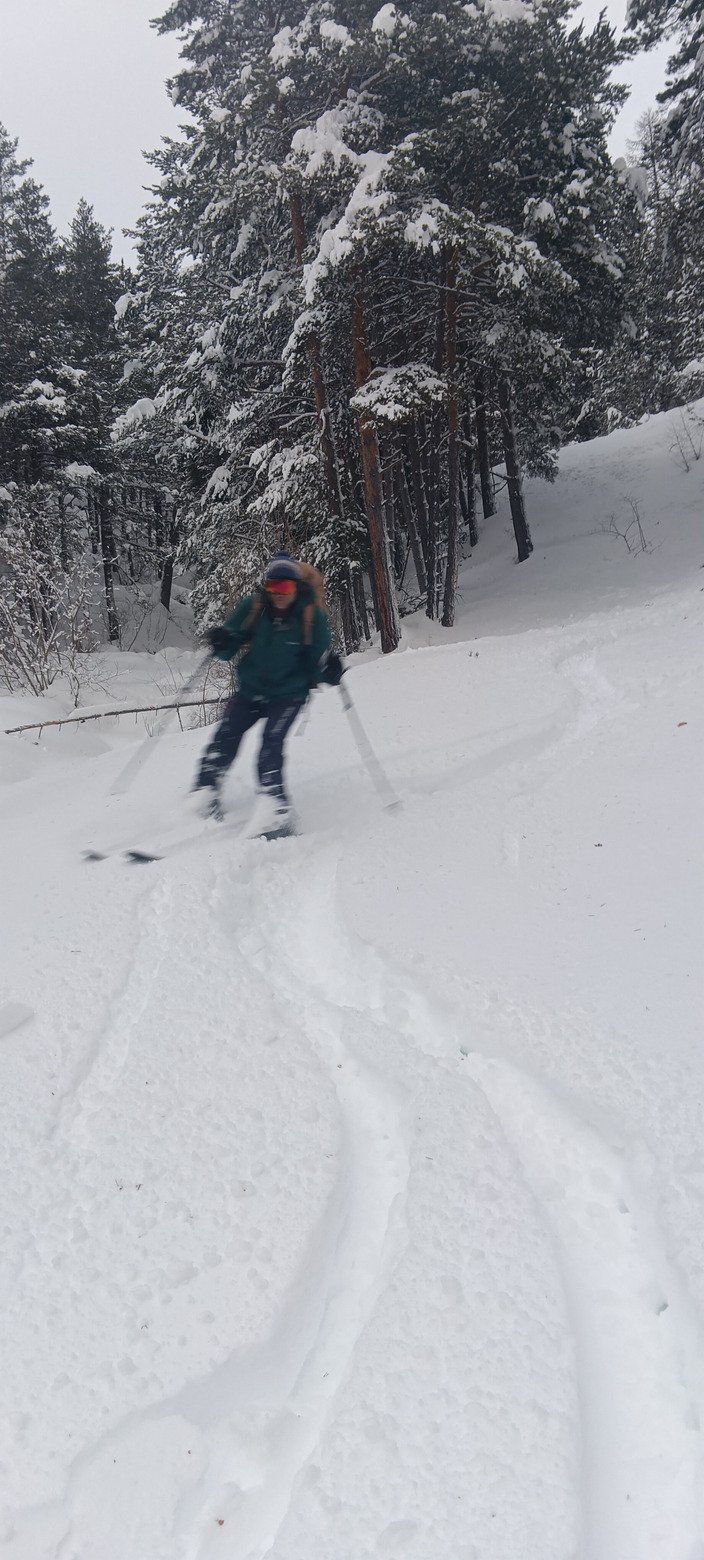 Pour finir cette magnifique journée (enfin pas pour la météo, mais perso c'était parfait pour faire rester au chaud de nombreux vacanciers pendant qu'on se gavait😂), on descend de Montgenèvre aux Alberts (500 m de dénivelé plus bas) via le sentier du facteur. Un peu laborieux au départ car c'est quasiment plat et il faut faire la trace... puis très sympa quand la pente se raidit un peu (sans jamais être forte).
