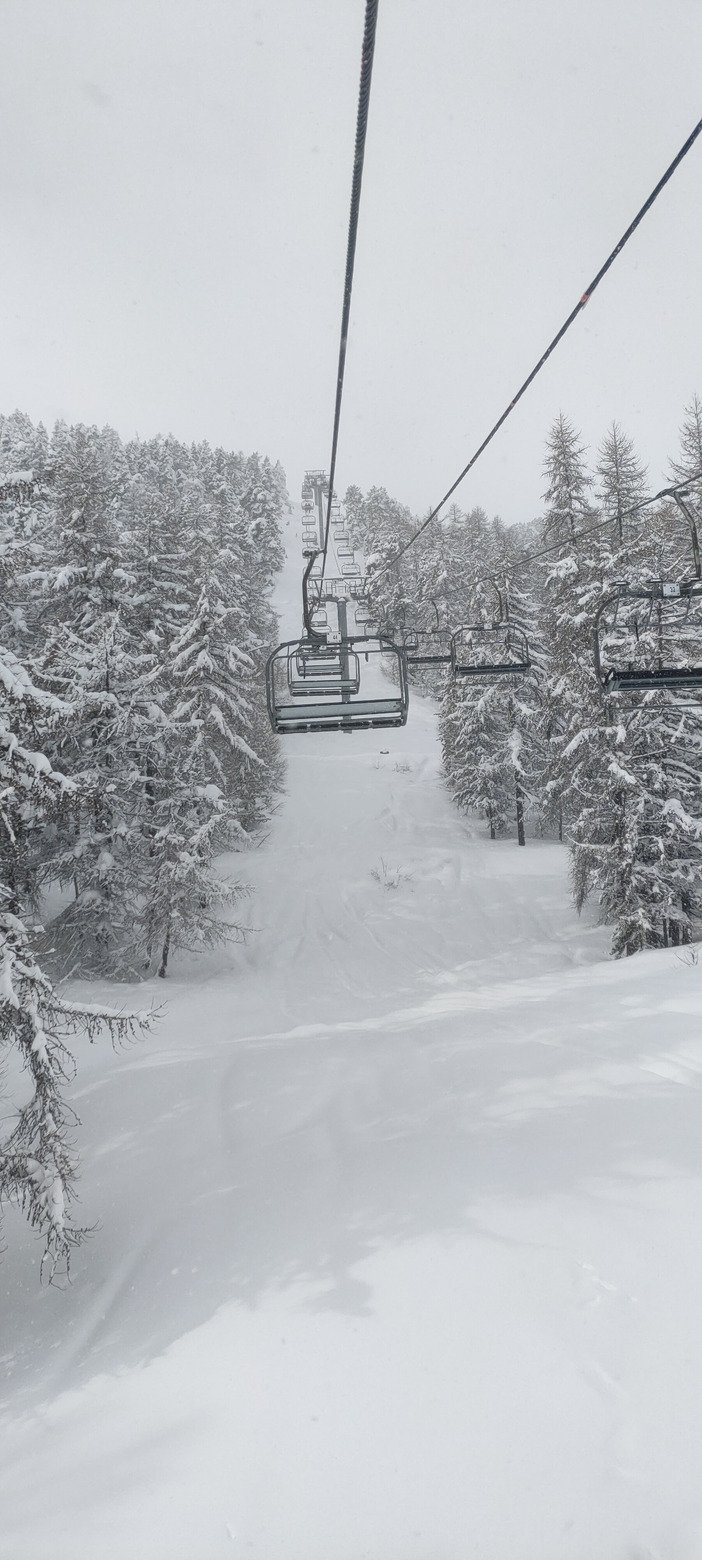 Il est retombé entre 20 et 30 cm entre cette nuit et le début de la matinée. On débute vers 11h30 sous la neige (mais alors peu de vent). C'est absolument délicieux aussi bien sur piste (5-10 cm de velours poudreux sur fond damé) que juste à côté. Sur le secteur Chalvet, il n'y a quasiment personne.
