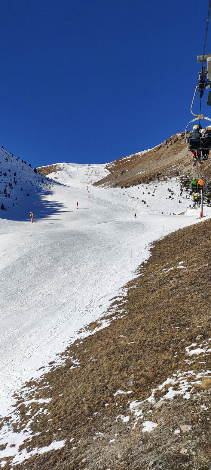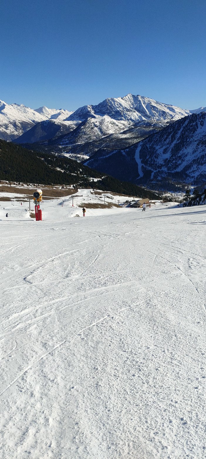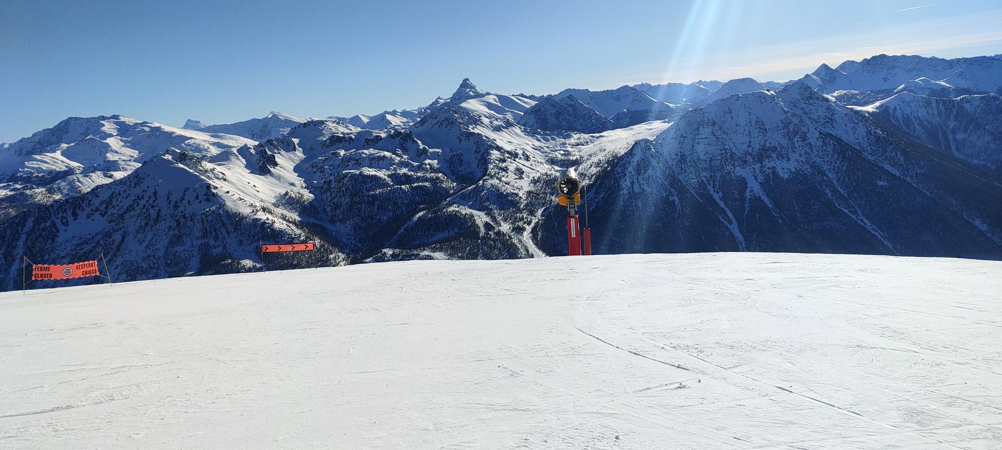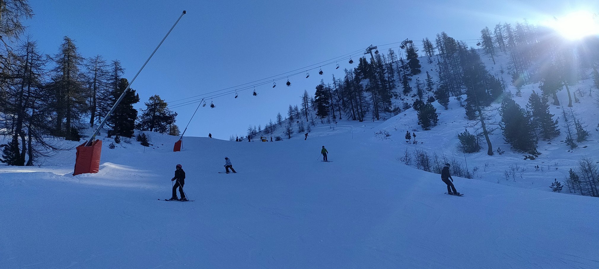 Heureusement le retour du froid a permis de faire tourner les canons. Je ne suis pourtant vraiment pas fan de la neige à canon en temps normal, mais pour le coup j'ai été très agréablement surpris par la qualité produite, de type poudreuse. Évidemment, quelques parties un peu lustrées au milieu des pistes, mais sans plus. Et souvent des projections de neige sur les bords très agréables à skier.