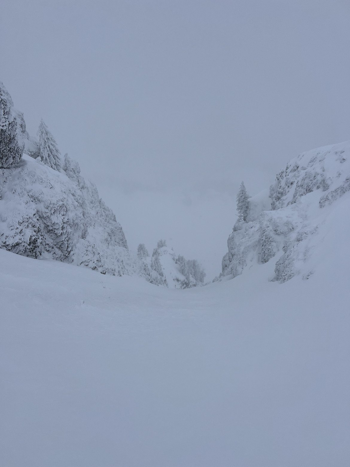 Les pistes sont pas mal avec une mini couche posée hier. Côte hors pistes y’a 3 couloirs du rocher de l’aigle qui ont des belles accumulations, attentions aux sharks des qu’il y a une crête. Il vaut mieux connaître l’accès, avec ce brouillard il y a risque de se perdre et d’arriver sur des barres rocheuses pas cool.