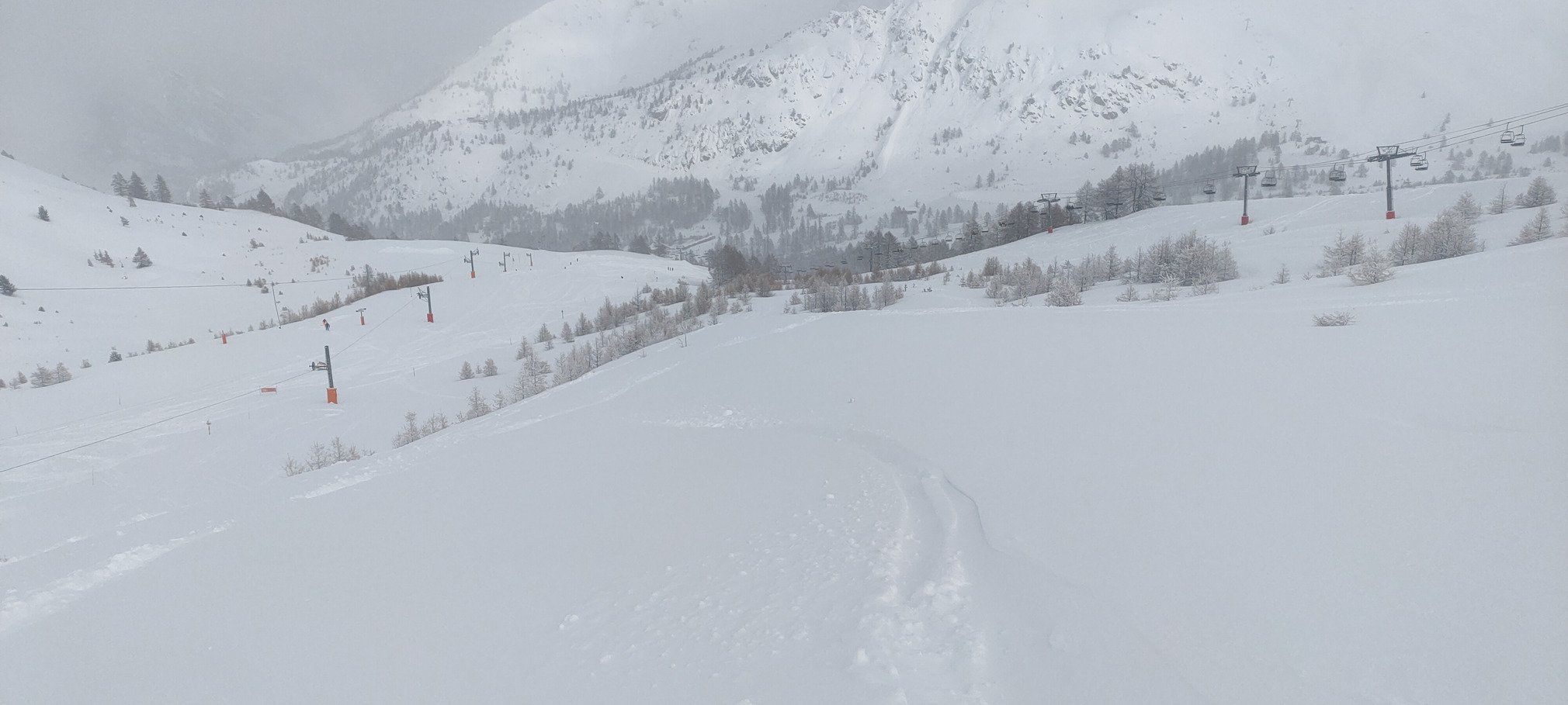 Il a neigé jusque vers 14h, puis ça s'est découvert l'aprem. C'était magnifique pour les paysages, mais la poudre s'est du coup pas mal alourdie et commençait même limite à coller sous 2000 m. Après, ça restait très sympa à skier dans cette poudre sans fond, où il fallait néanmoins aller assez droit - ou se remettre dans les traces - pour garder de la vitesse. Bref, il y avait presque trop de neige !