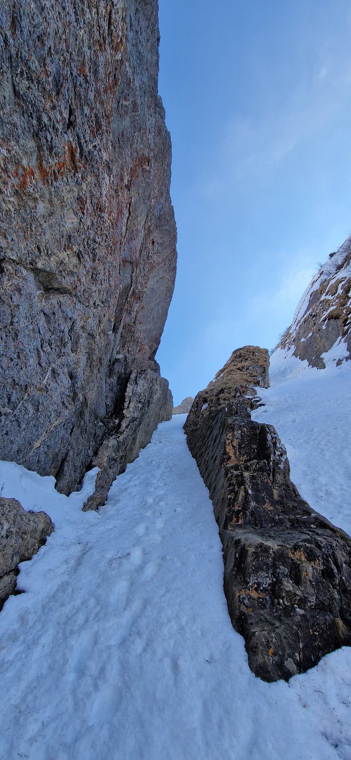 Nous sommes monté dans le couloir de la virgule pour arriver au sommet de la tête de Bostan. L'itinéraire est vraiment très esthétique avec une barre rocheuse en forme de virgule tout le long de 5m de haut puis une magnifique brèche dans cette falaise sous le sommet.