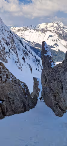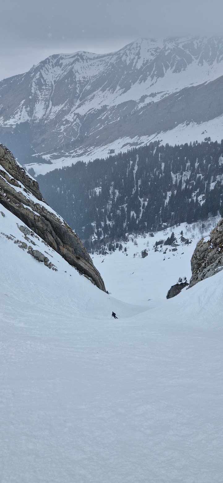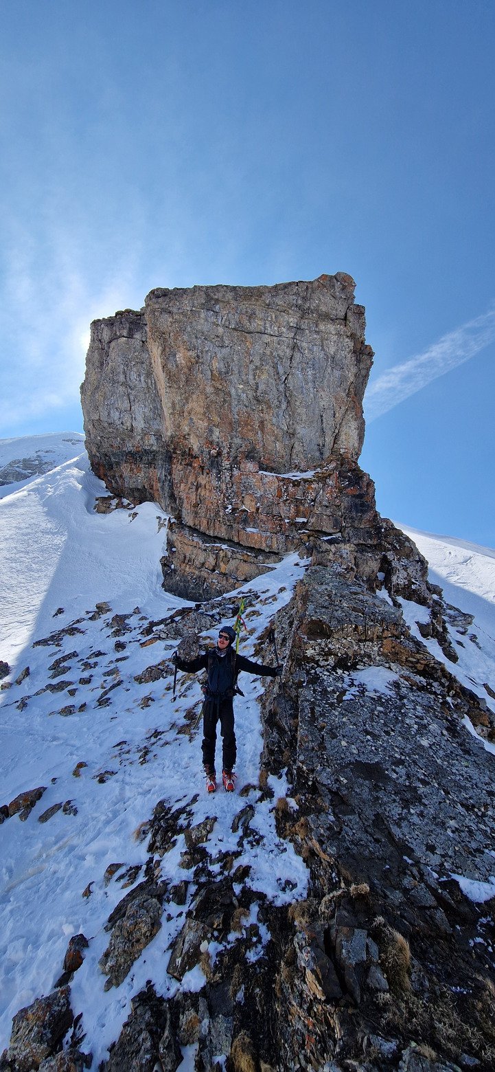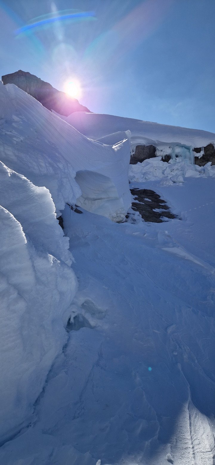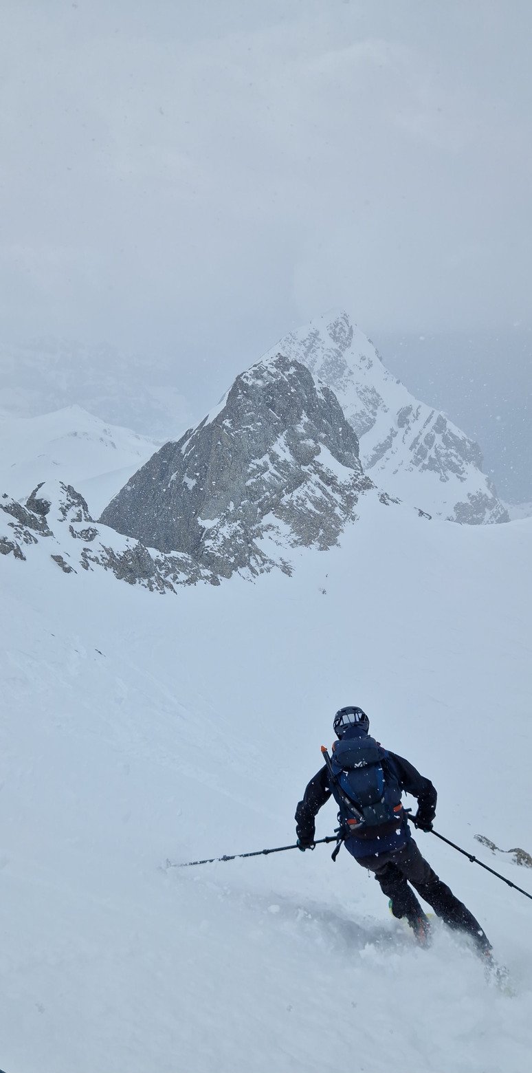 La descente est tout de même bien agréable en face nord avec une neige dense mais froide très bonne à skier dans un décors type haute montagne avec des corniches impressionnantes !!