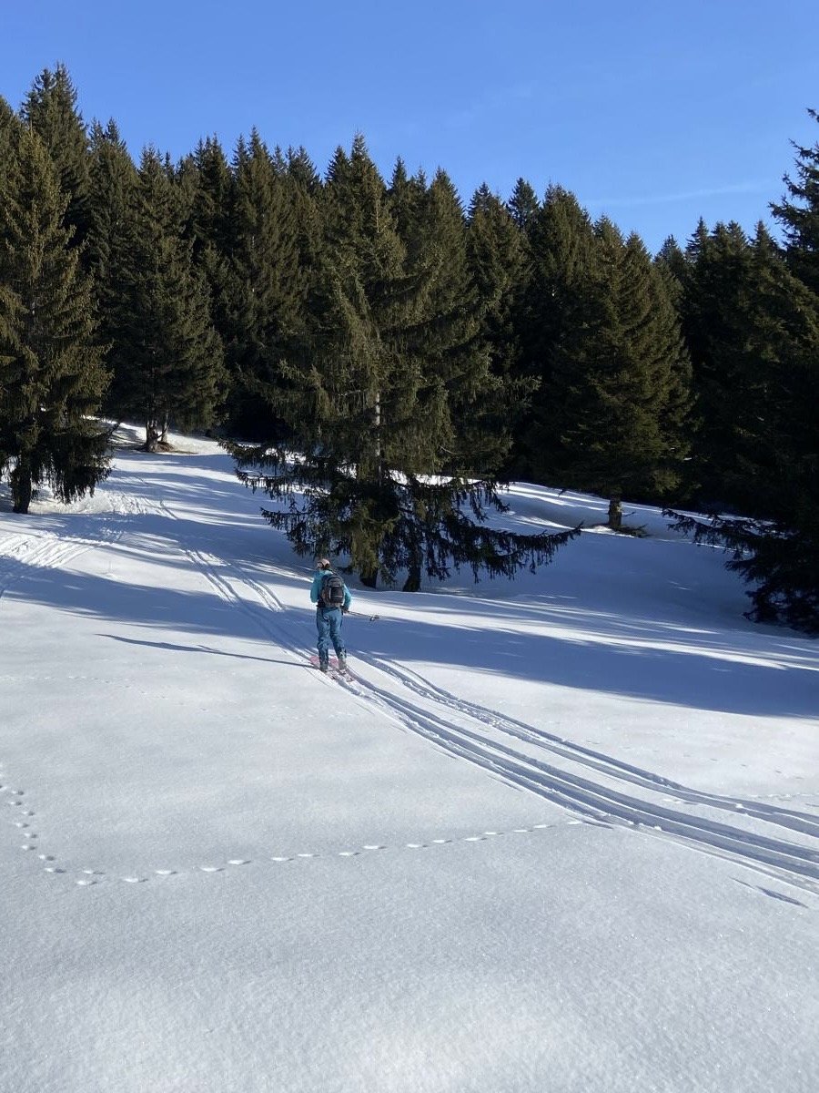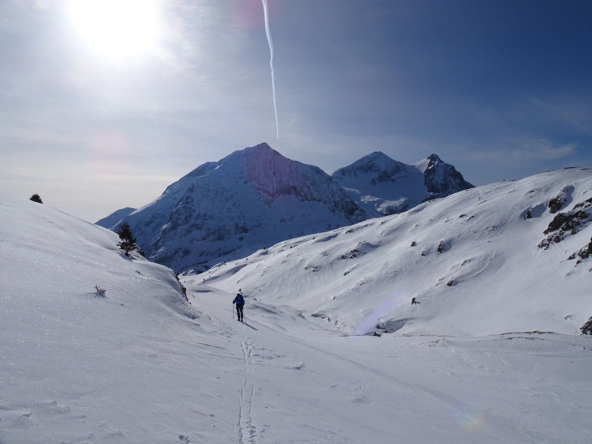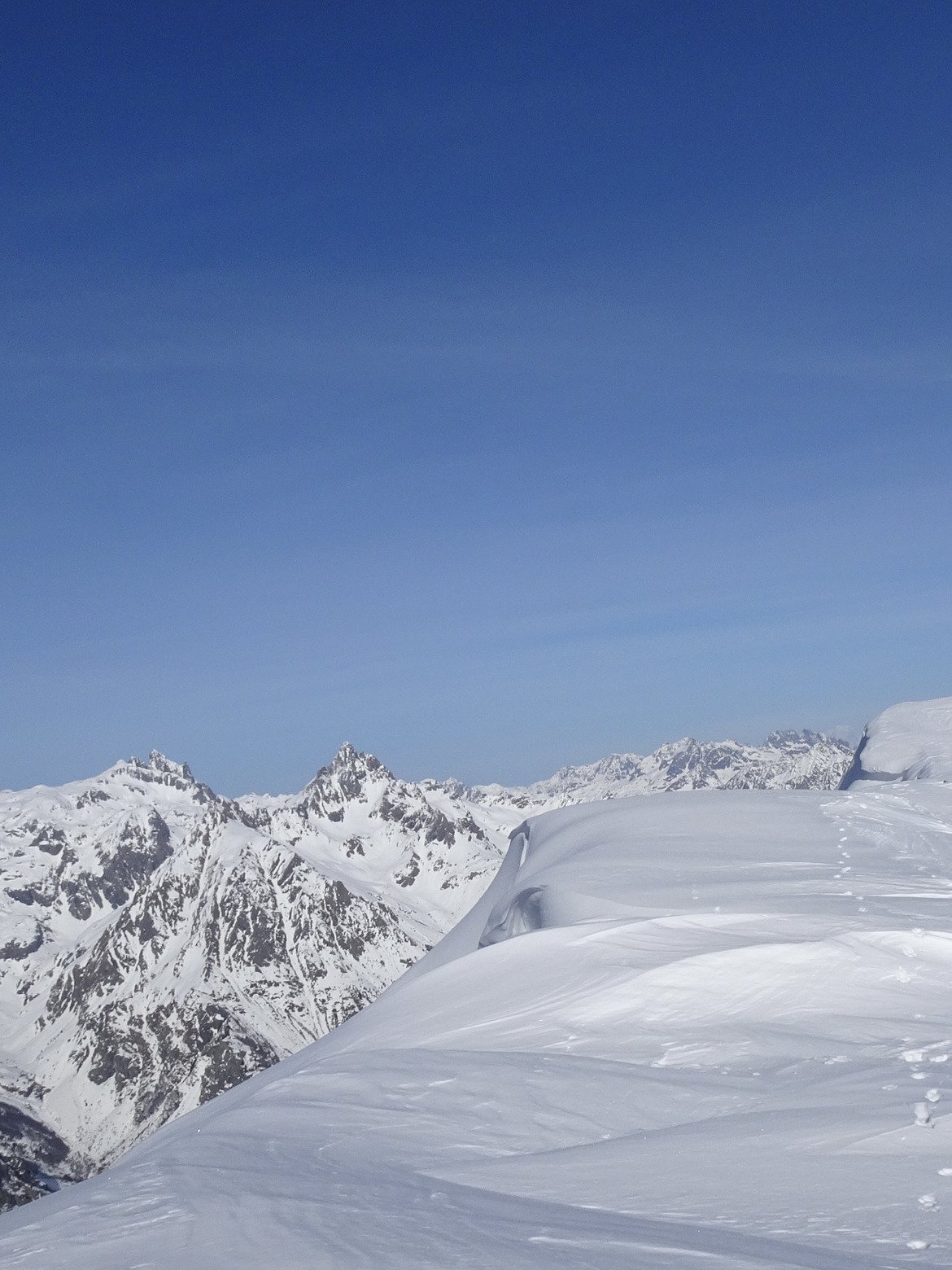 Petite randonnée en Oisans. Départ 1300m, la neige est gelée jusqu'a 1600m, nous montons sur des pentes sud, le soleil n'est pas encore bien là. On sortira les couteaux sur les pentes un peu plus raide. A partir de 2000m , le vent à fait sont travail, on alterne entre neige soufflée et cartonnée jusqu'a 2600. La descente se fait un peu tard, on a explosé l'horaire, trop de km. Du coup nous n'avons pas eu le décaillage. Heureusement nous avons trouvé quelques combes abritées avec de la presque bonne neige. Les paysages grandioses, et nous étions 5 sur la montagne, moi, mon Patoch et 3 militaires;)