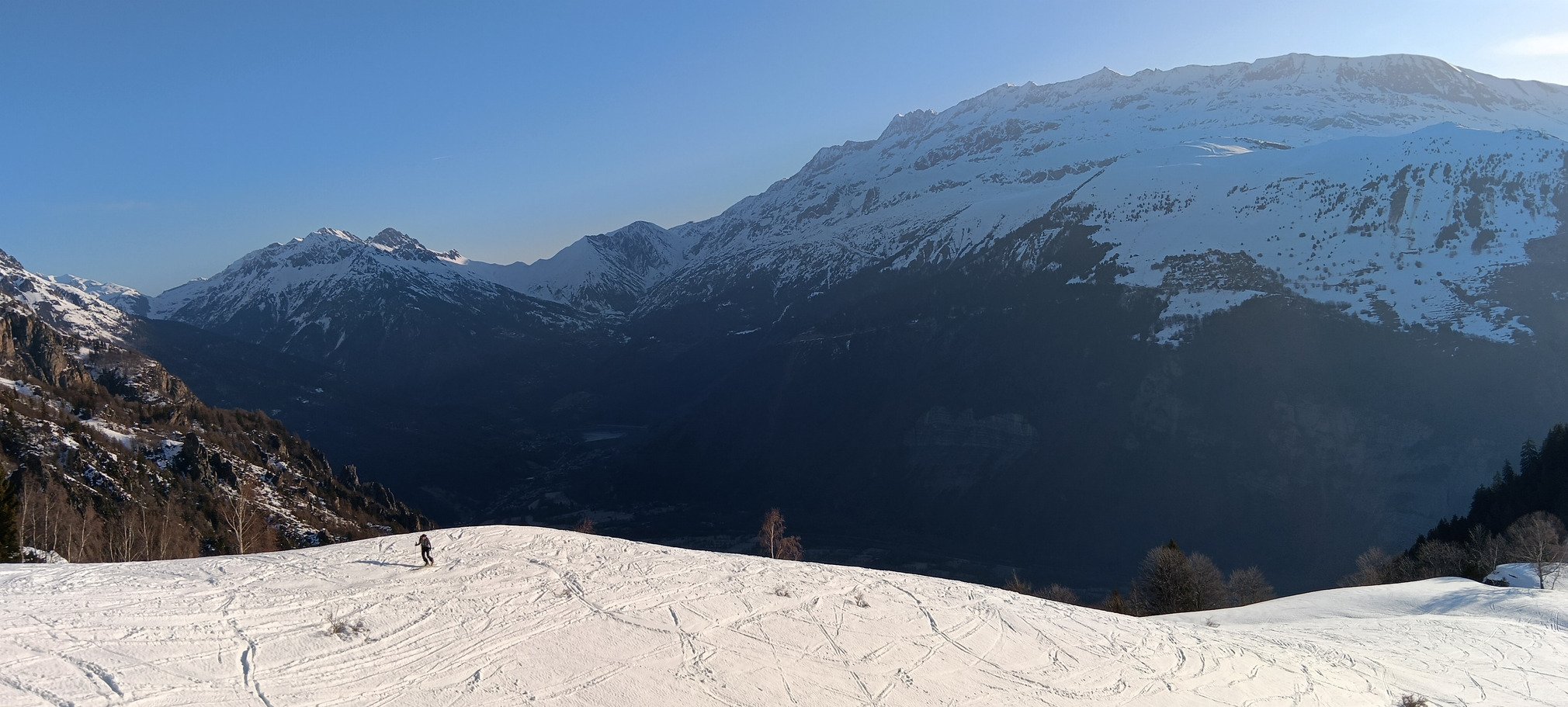 Départ d'Oulles (1400 m d'altitude) quasiment skis aux pieds (ce n'est pas toujours le cas ici, même au coeur de l'hiver) vers 7h30. La neige est dure, mais pas glacée. On avait pris les couteaux au cas où, mais finalement pas besoin de les mettre sur cette montée directe au Grand Galbert, qui présente l'avantage d'éviter l'interminable plat du chemin d'été.