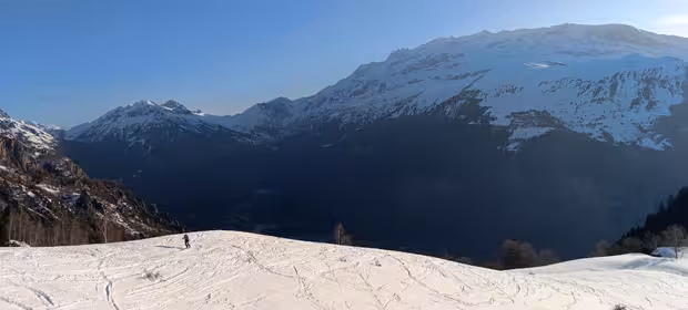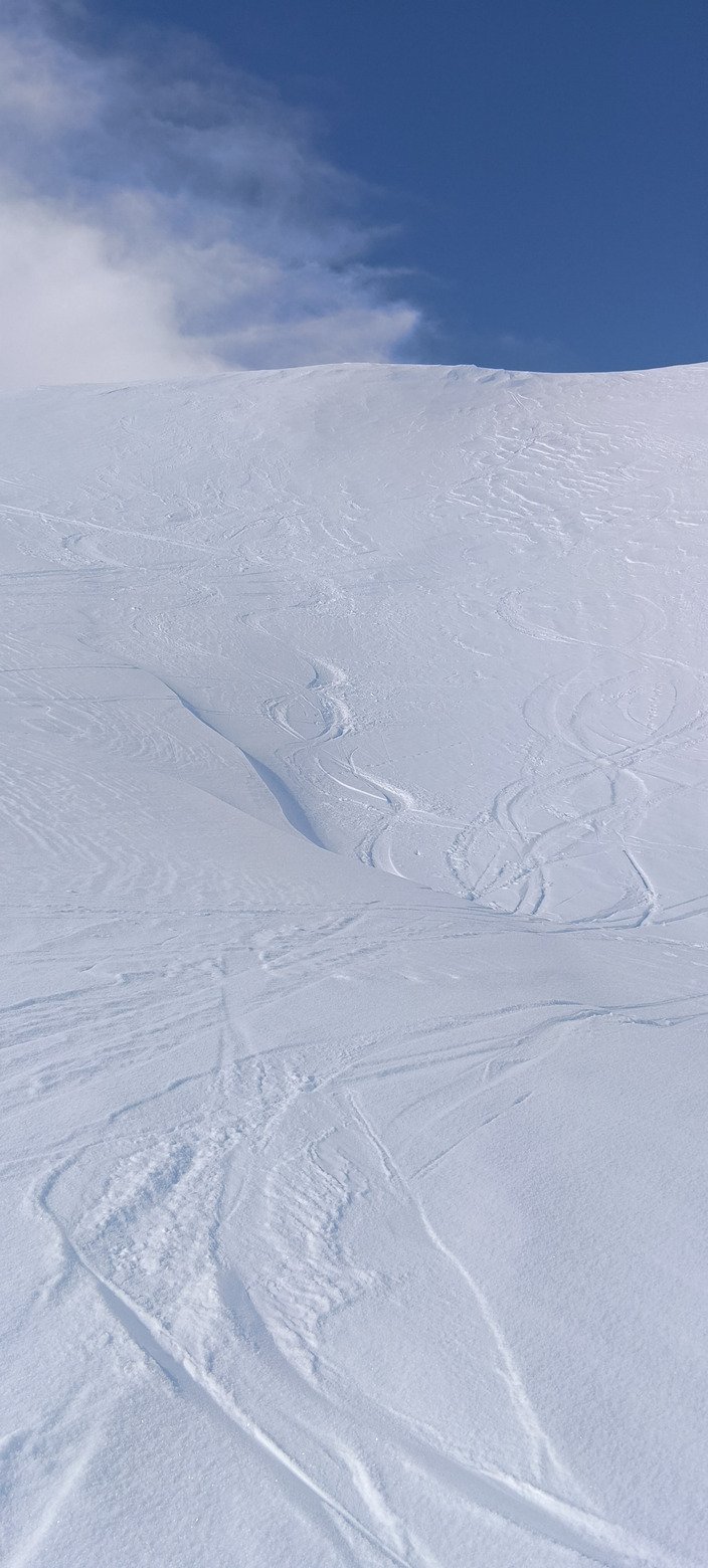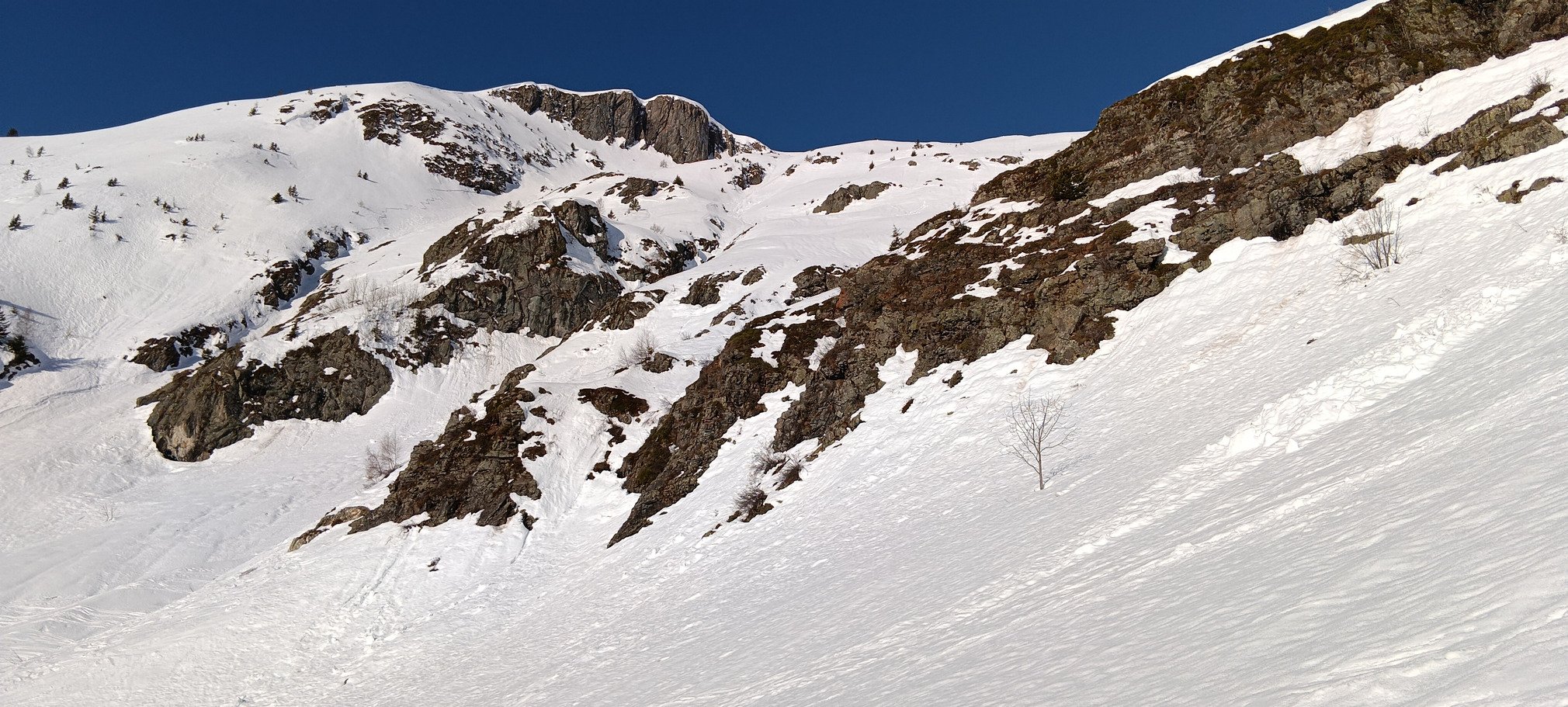 On démarre la descente à 10h45. La première courte pente (à peine 100 m de dénivelé) est toute traffolée pas decaillée, vraiment pas terrible. Mais ce sera la seule portion bof à skier. Derrière, c'est tout bon, avec même quelques virages poudreux (entre 5 et 10 cm) sur des contrepentes orientées Nord. Mais le gros de la descente se fait sur une excellente moquette à poils longs. Il y a certes eu pas mal de passages dans ce vallon assez large, mais encore des sections vierges très agréables.