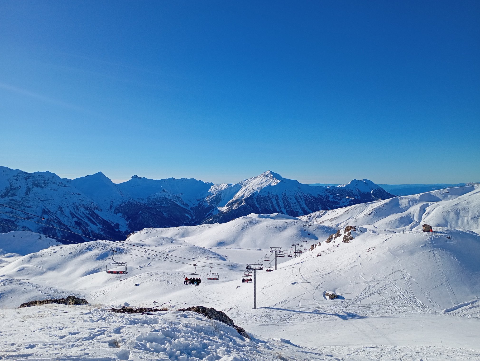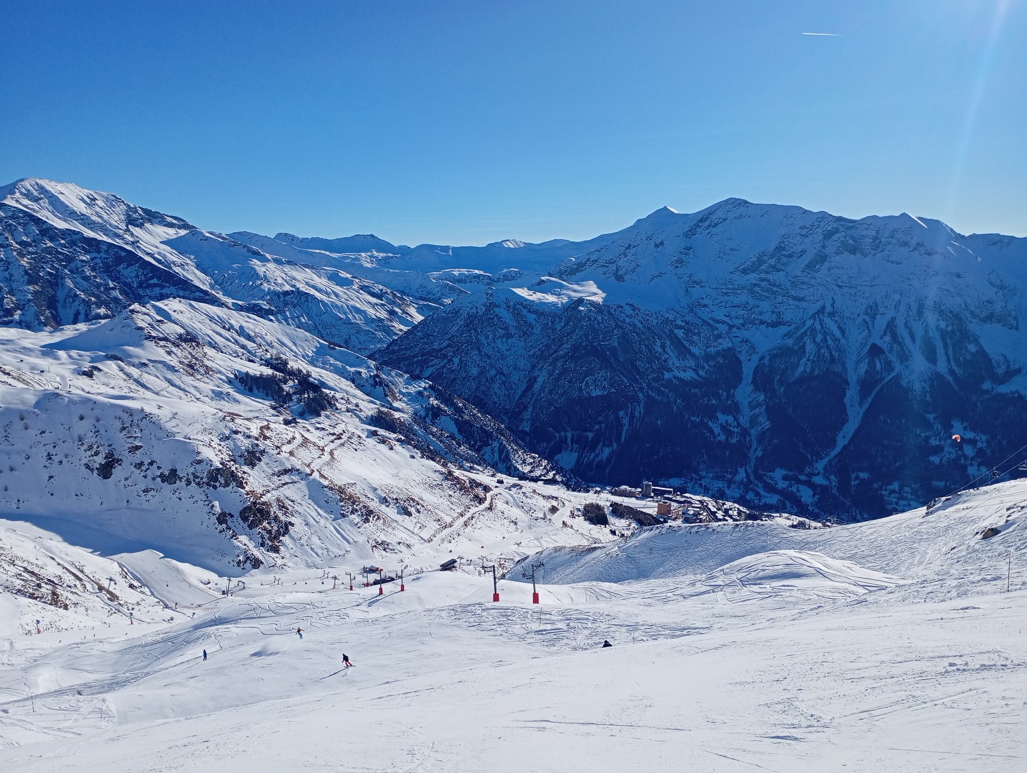 En dessous de 2000-2200 mètres seules les pistes restent bien enneigées, avec de grosses tâches d'herbes qui rappellent qu'il fait beaucoup trop chaud pour la saison. Au dessus, la couche de neige est bonne (secteur Drouet II et les Estaris) et on retrouve un paysage montagnard même si en hors piste la neige reste dure. Malgré tout, très bonnes conditions, beau soleil, pas de vent, pistes bien préparées malgré le manque de neige... Des conditions d'avril quoi ! Le nouveau télésiège est très bien, ça permet de monter très vite vers Méollion et ça désengorge bien Drouet I !