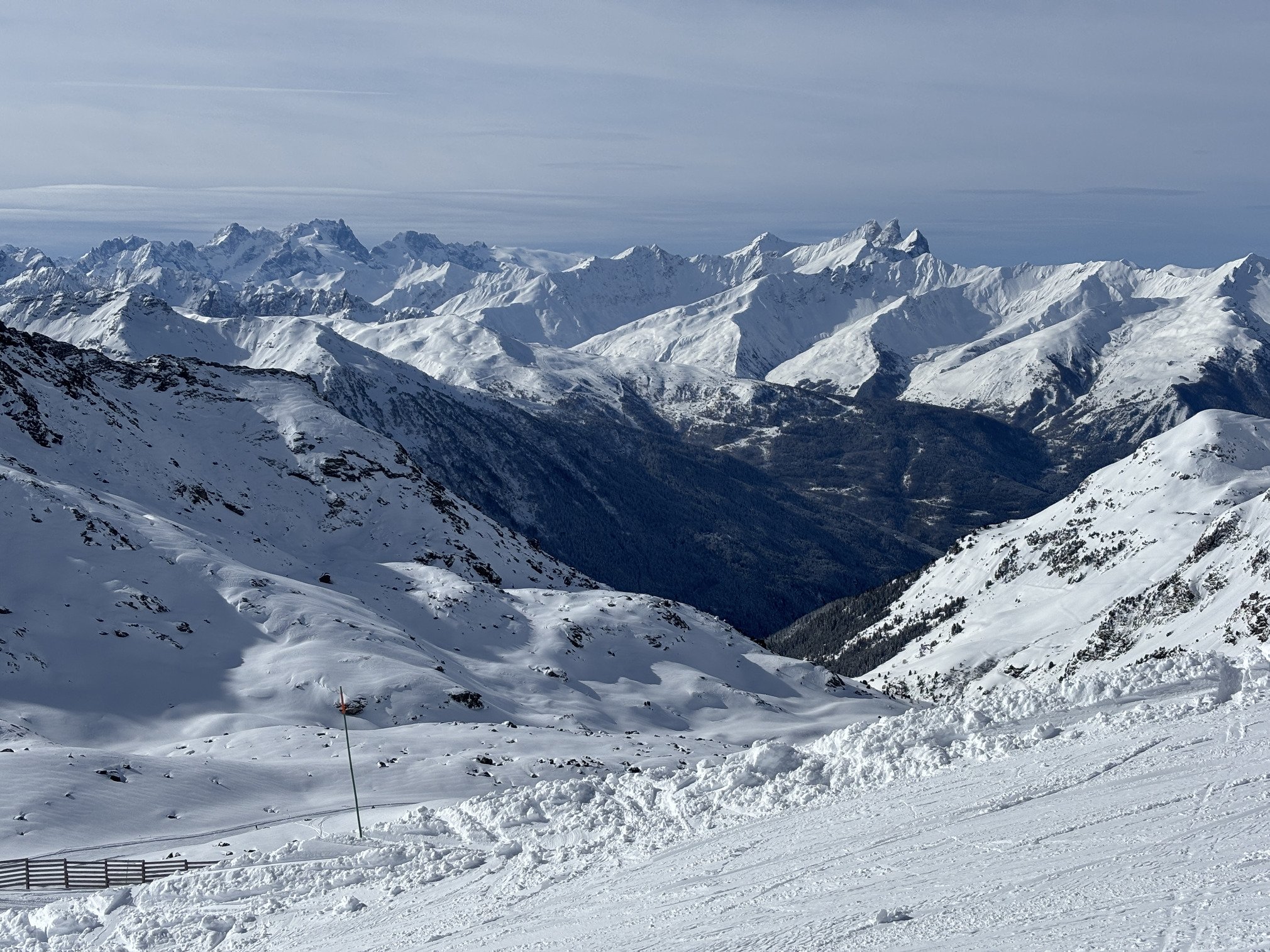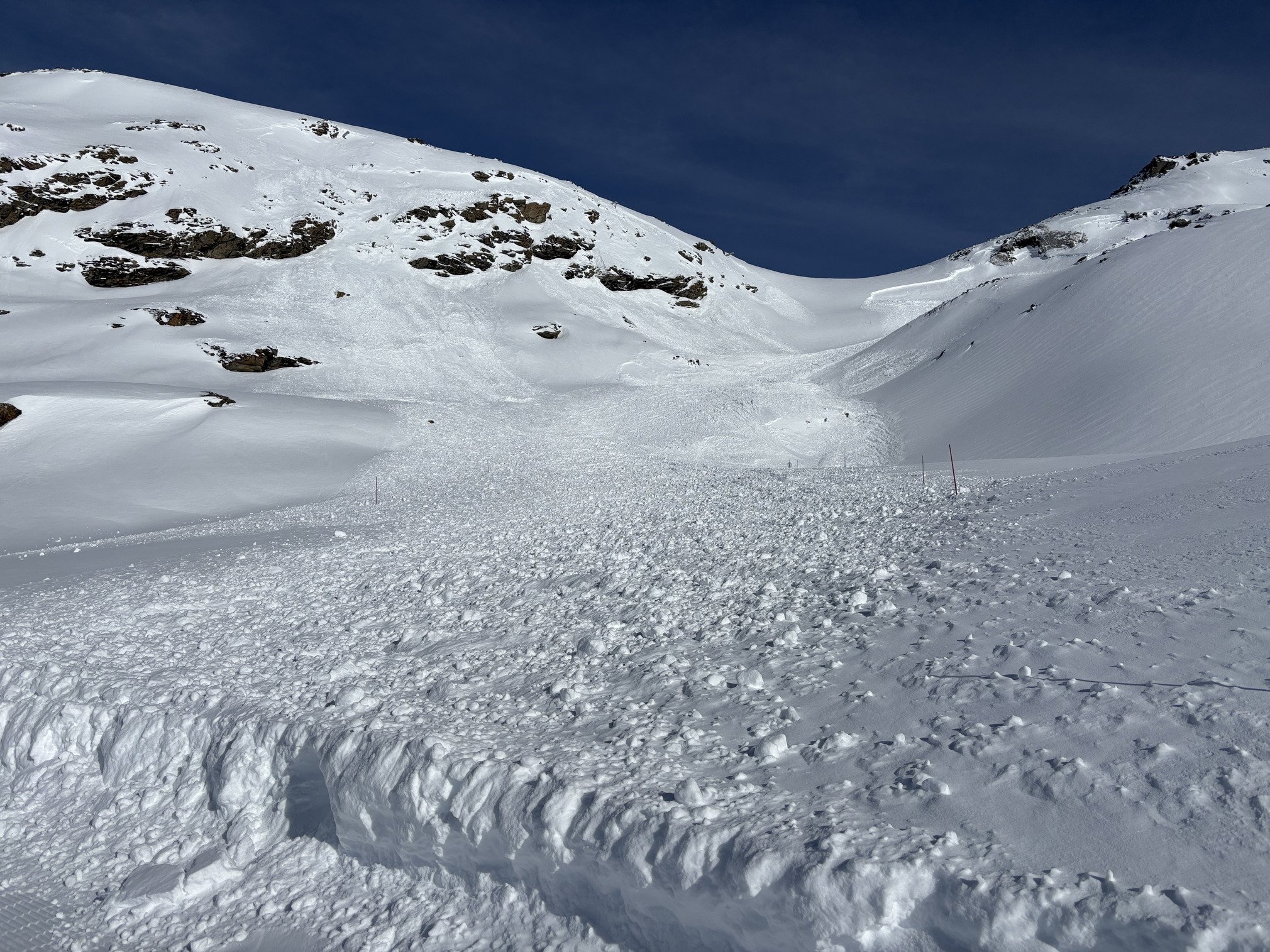 Sous Peyron c’est de la boucherie car les gens finissent englués sur le replat, et sur les pistes du haut aussi mais pour une autre raison: d’énormes coulées ont été déclenchées sur le bas de Bouchet et de Coraïa et viennent plomber l’ambiance, le télésiège du haut est bien sûr fermé car la montagne est très dangereuse en ce moment, même si elle paraît calme.