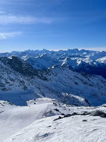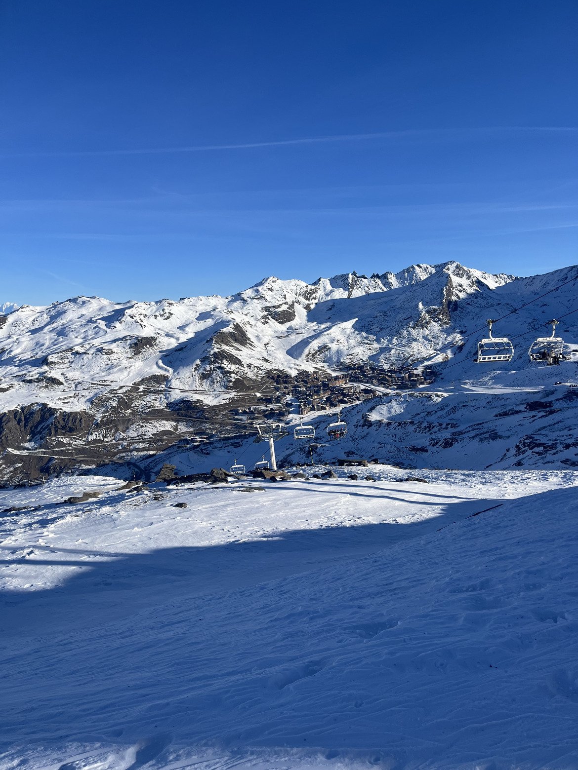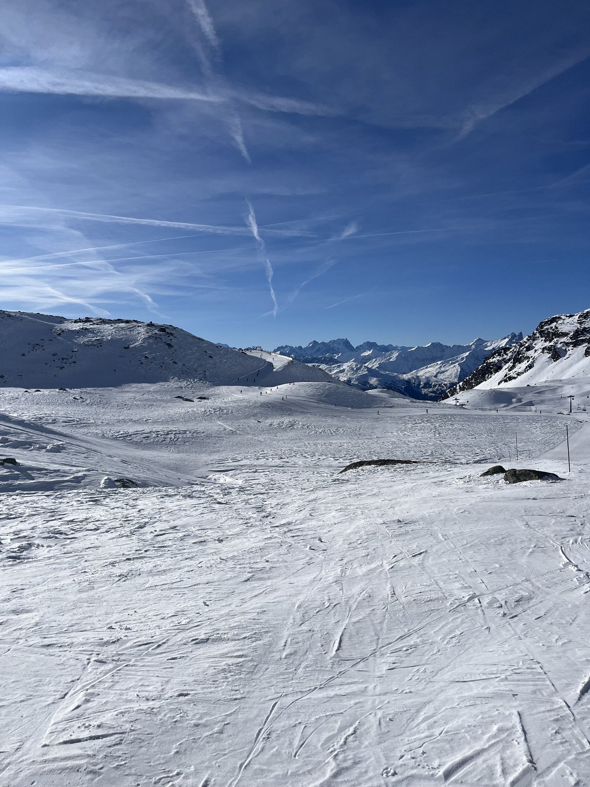 La neige n’a pas vraiment évolué depuis ces derniers jours, c’est skiable, mais elle reste très dure. Quelques petits cailloux par-ci par-là, mais rien d’insurmontable. Et quelques plaques de glace, traîtres sur le bas de la station, qui m’ont valu une petite galipette (la première depuis bien longtemps). Donc on adapte la vitesse et on profite des paysages magnifiques et du grand ciel bleu. La quasi ta totalité du domaine, à quelques pistes près est ouverte et ça, c’est la force des 3 200 m au sommet et de son attitude moyenne très élevé.