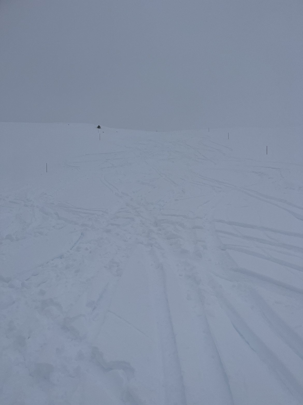 L’après-midi, le temps se dégrade encore plus, avec un brouillard tellement épais qu’il n’est même plus possible de voir le piquet d’après. Je décide quand même d’aller faire La Masse avant de rentrer à tâtons en direction de la voiture.