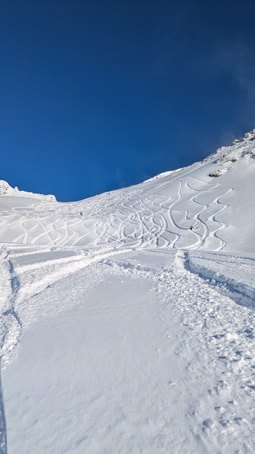 Les pistes fermées se tracent avec plaisir, et les pistes ouvertes sont en neige froide et tendre jusqu'en milieu d'après-midi, elles bosselent tout de même en fin de sortie.