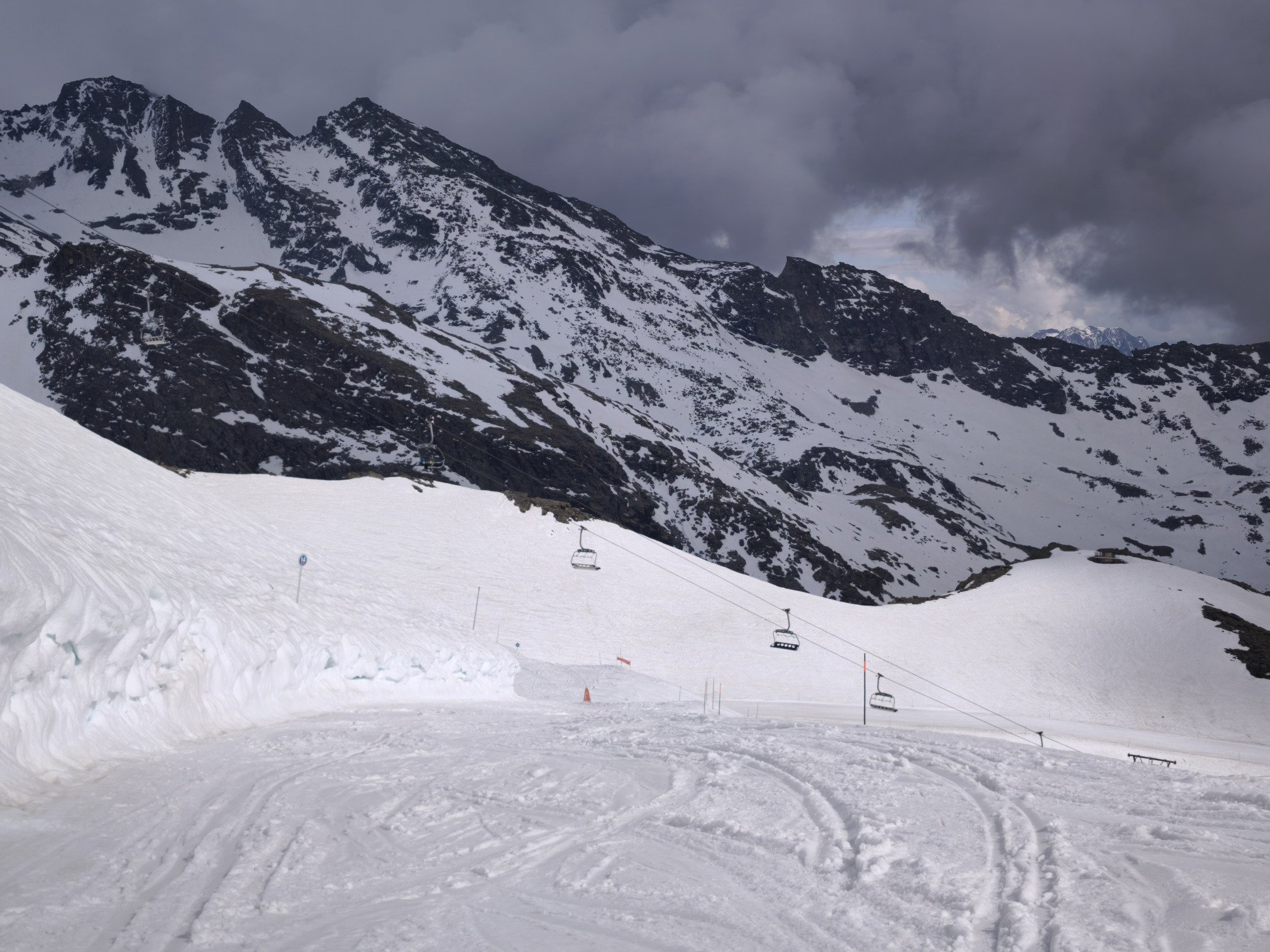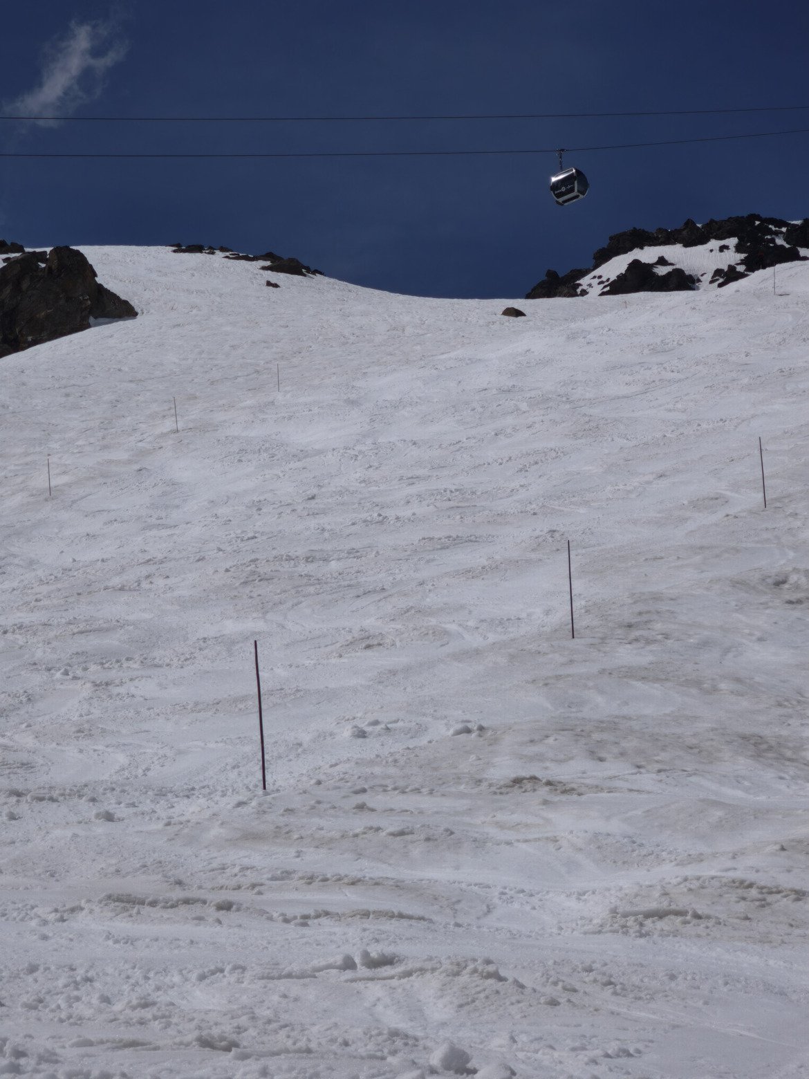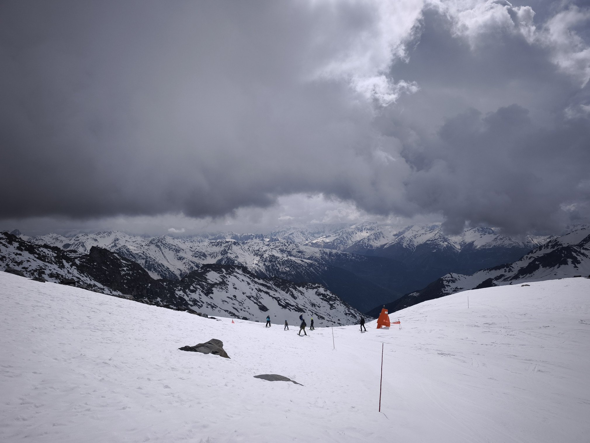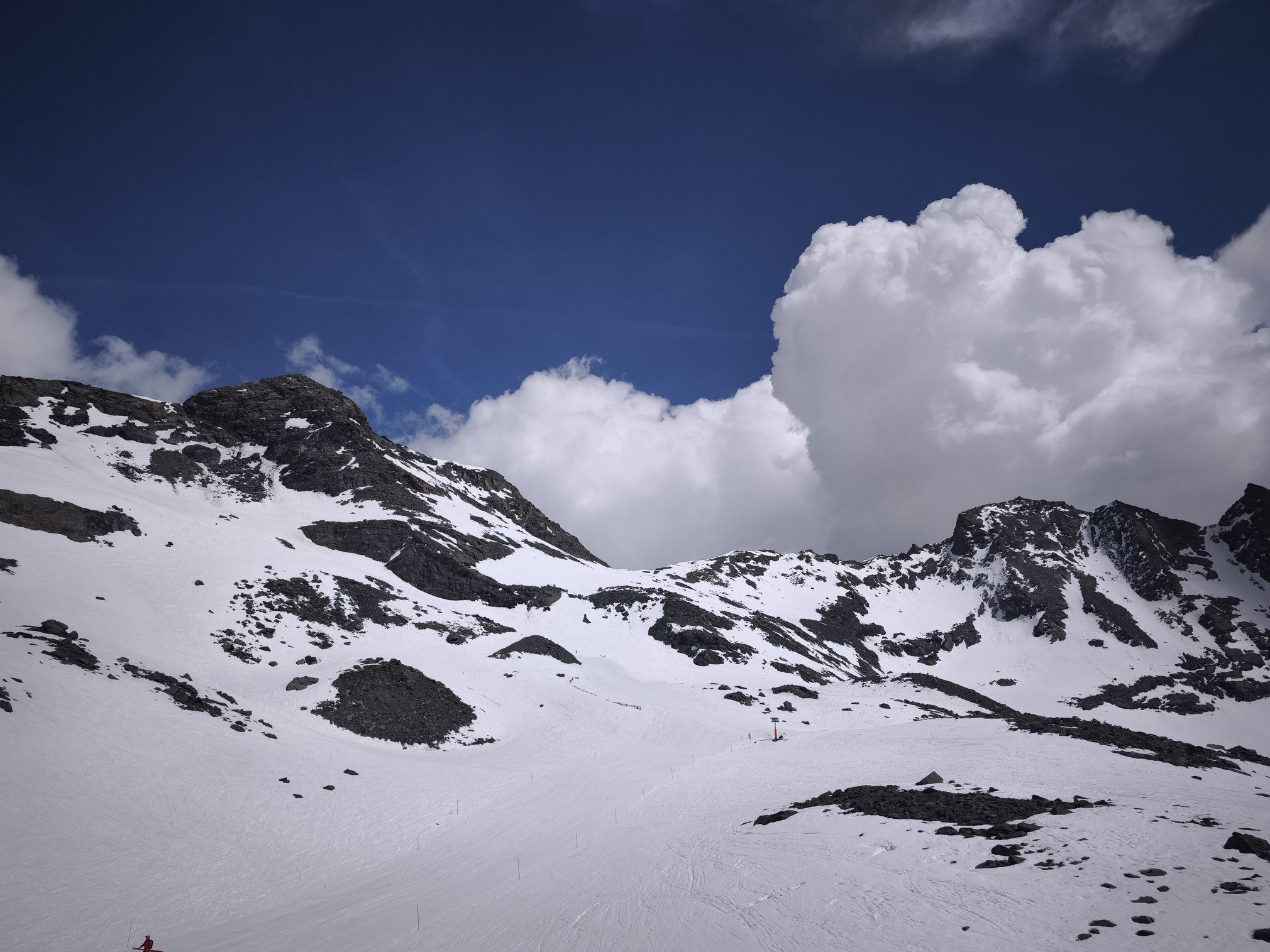 Après les éclaircies de la matinée les nuages ont gagné de plus en plus de terrain. Vers 14H une petite averse du côté de la Cime Caron puis soleil de plomb sur la Combe de Rosaël. La qualité de la neige s'est beaucoup humidifiée et les bosses du bas du mur ne sont pas au top leur forme ! Ça a beaucoup fondu et quelques roches apparaissent mais elles sont bien signalées et on a le temps de les voir.