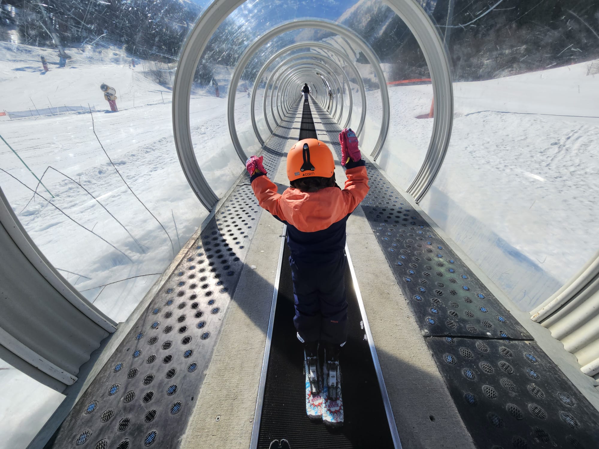 Deuxième montée tapis. Moment clé de récupération active : on engage une discussion tactique autour du rôle des dessins de bonhommes de neige dans l'aérodynamisme de ses chaussures de ski.