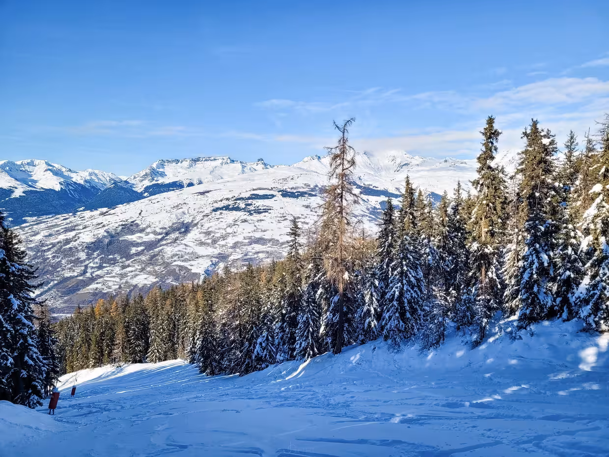 La montée se fait par une piste rouge entre les sapins, puis avec une belle vue dégagée sur l’Aiguille Grive en sortie de forêt, avec autour le panorama sur les massifs du Beaufortain et la Vanoise. Un gypaète cherche un thermique, et on profite du spectacle des rapaces de Vanoise.