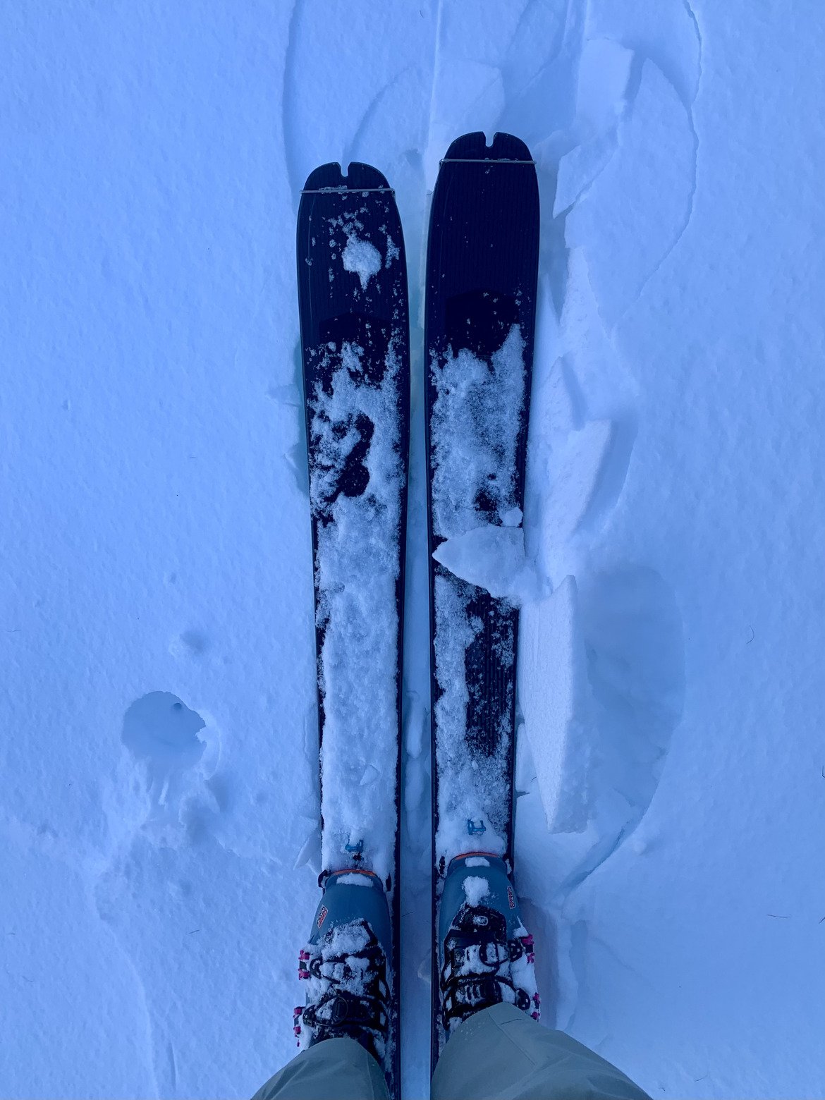 On monte jusqu’au dernier télésiège avant de se lancer dans la descente. La neige est encore globalement poudreuse, à peine humide au soleil. Sur les pistes, les alternances poudreuse/neige à canon/neige damée sont un peu inconfortables, avec par endroit une grosse croûte… mais idéales pour se remettre en jambe !