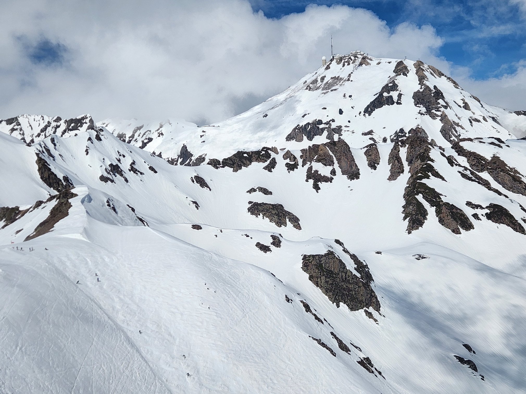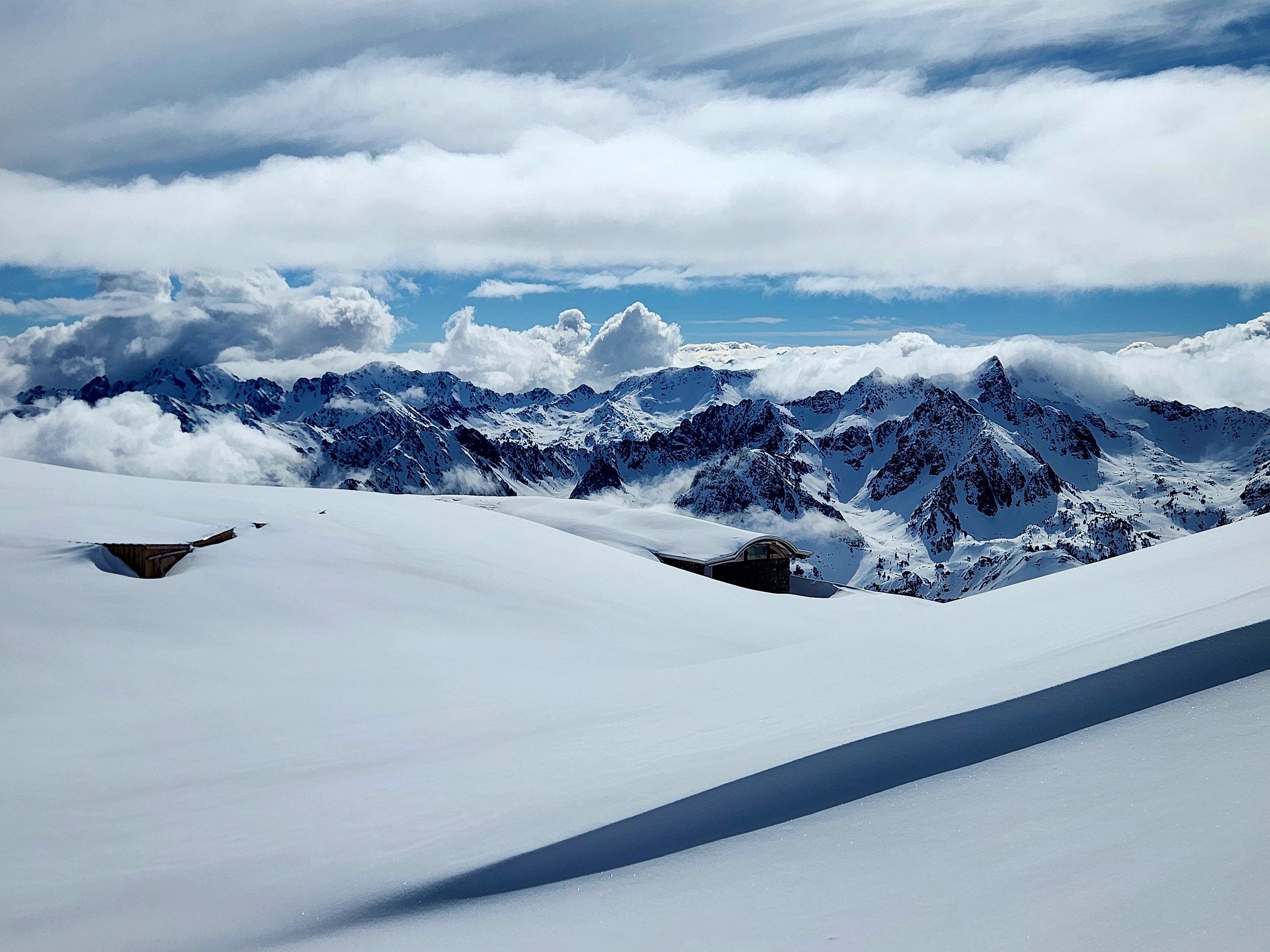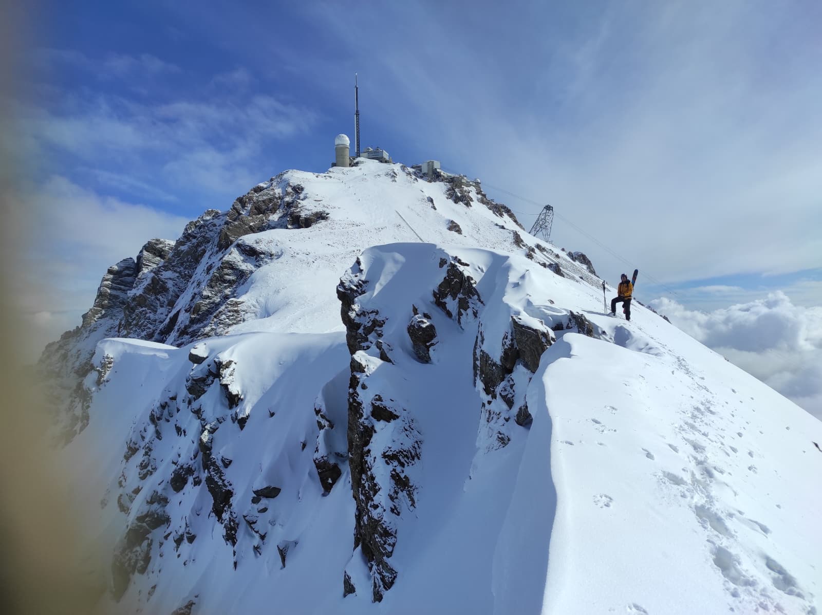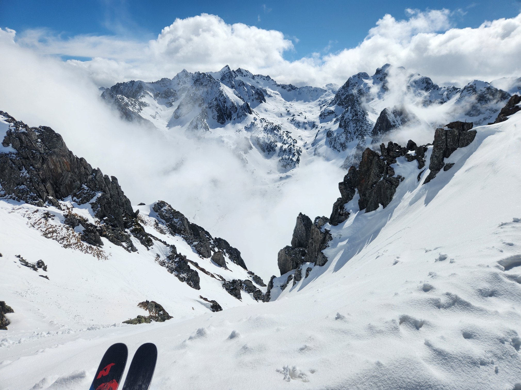 L'aller-retour dans Afterwork état tout aussi poudreux. Après une remontée de la Coume de l'Ours, nous avons repris la crête du Dièdre et les nuages arrivaient gentiment au départ du couloir. Ce dernier était lisse au début mais tout en grumeaux souples pour le reste. En dessous de 2000 m, la neige collait affreusement en Sud.
