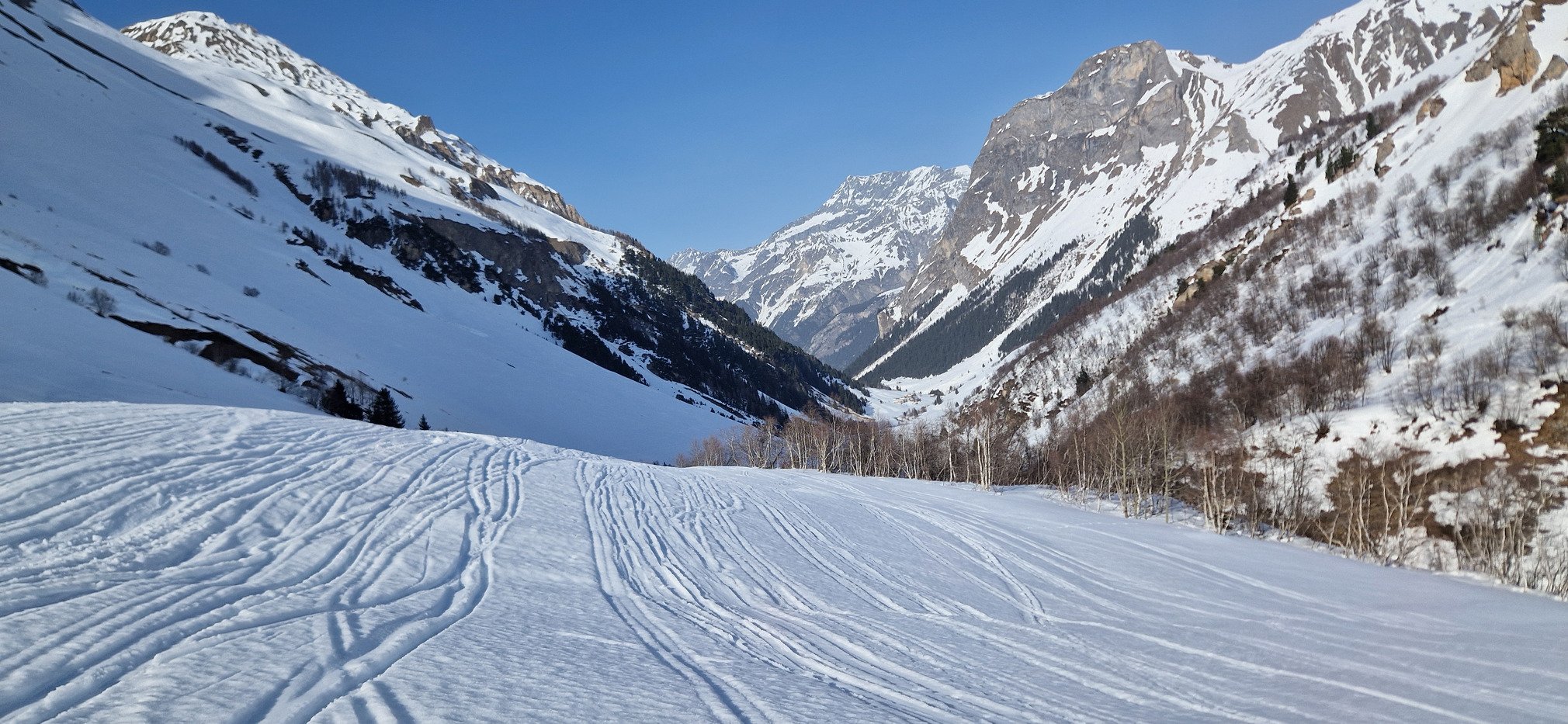 On se retrouve vraiment avec des conditions d'un mois d'avril mais avec de belles quantités de neige au dessus de 2000m. C'est super agréable, il fait bon sans qu'il fasse trop chaud, les paysages sont magnifiques et si on vise bien, on arrive à trouver une superbe moquette pour la descente.