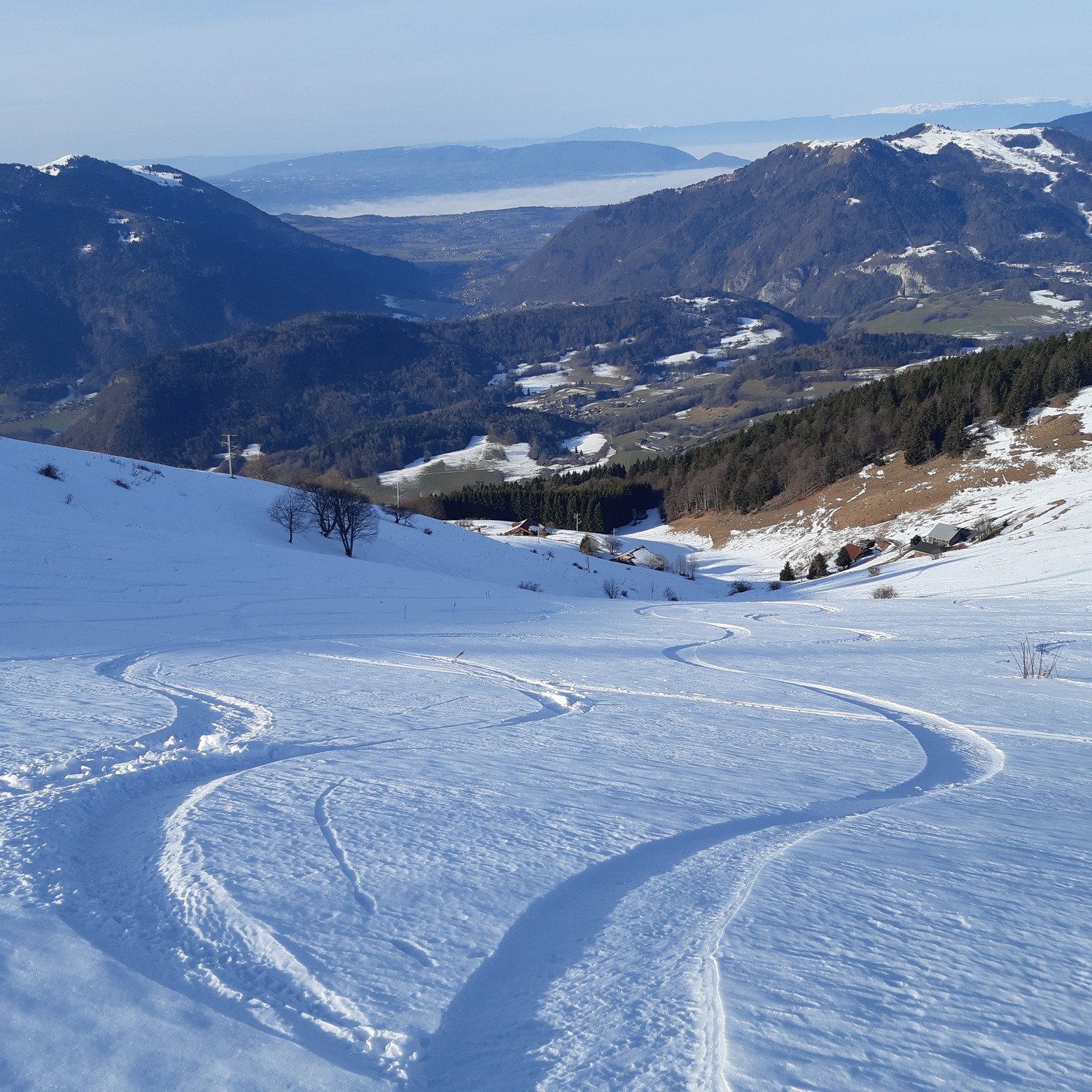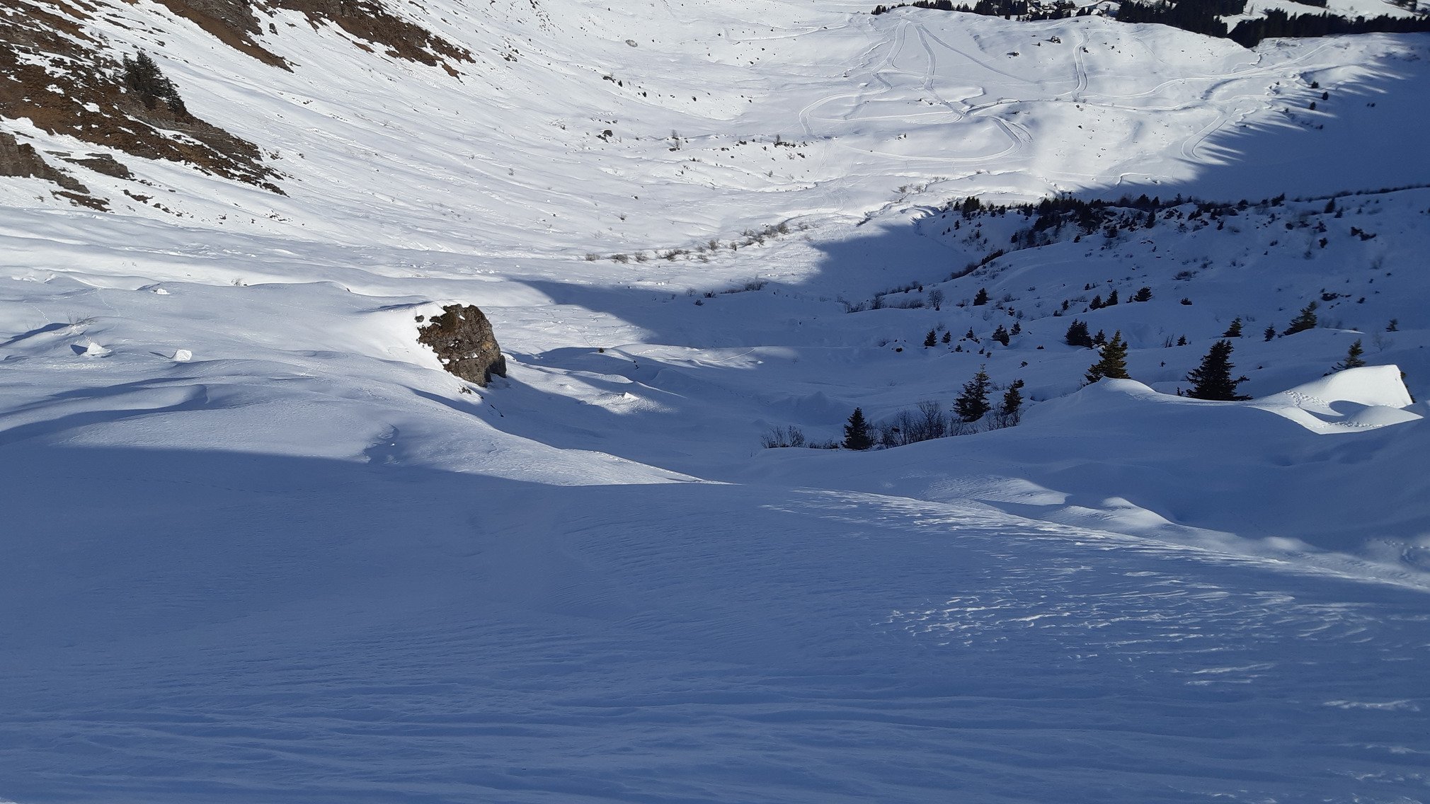 Des pentes entre la pointe de la Couenasse et Marcelly étant vierges de traces et trop alléchantes, j'ai dépeauté là pour une bonne descente dans une vieille poudre compacte.