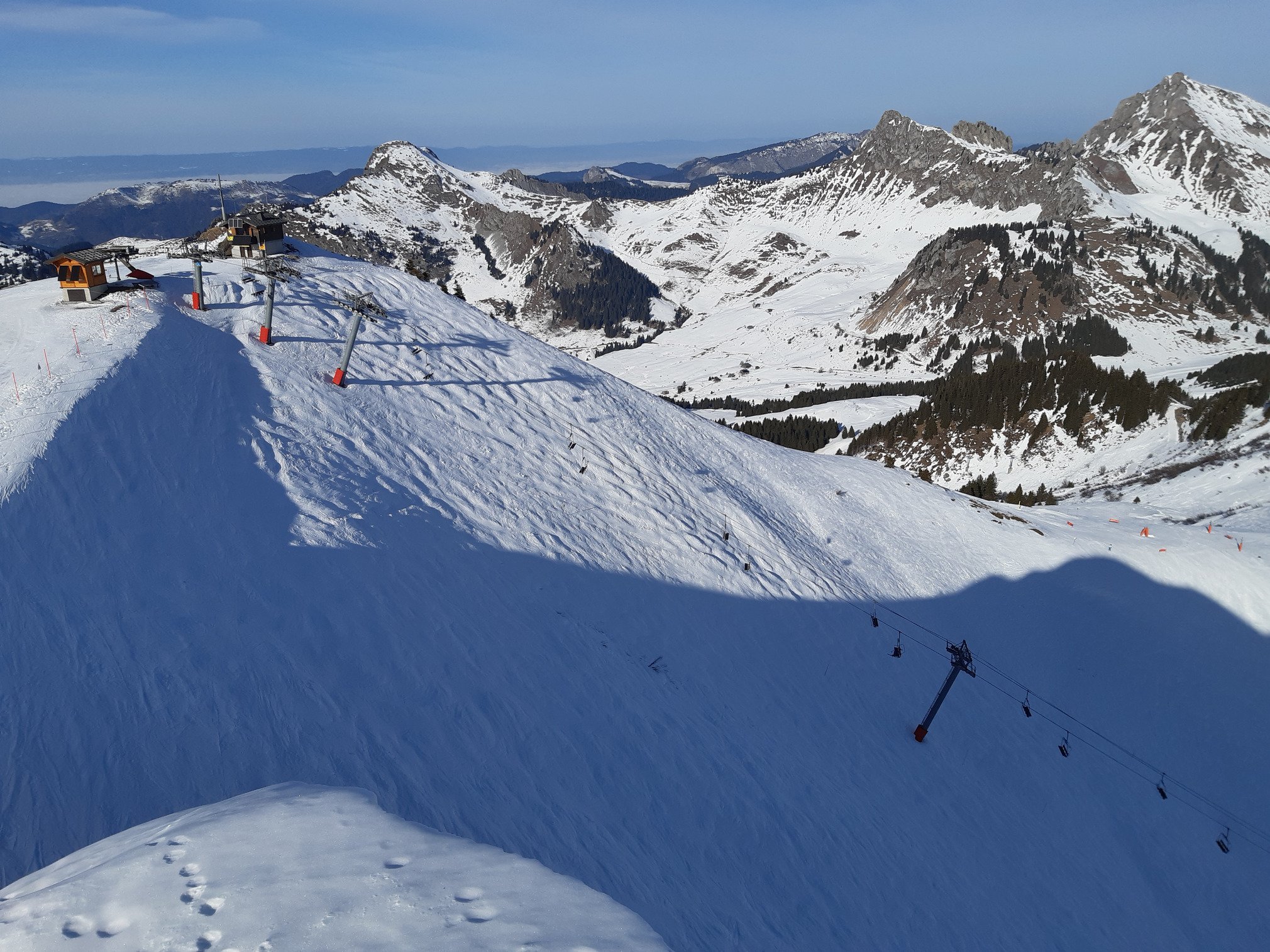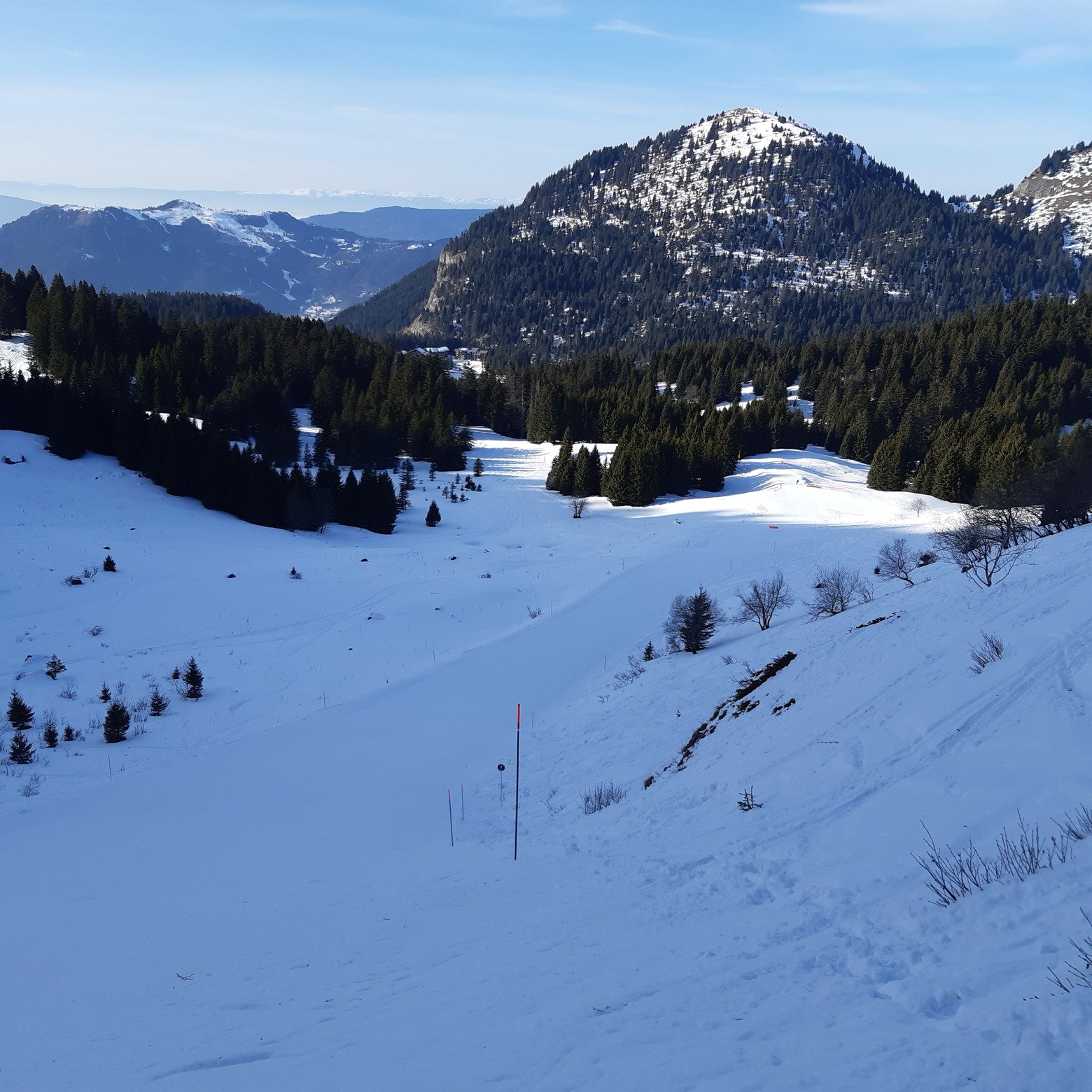 Descente à la Sommand par la Velard. La piste est en neige dure, mais il y a moyen de se faire plaisir en restant près des jalons.