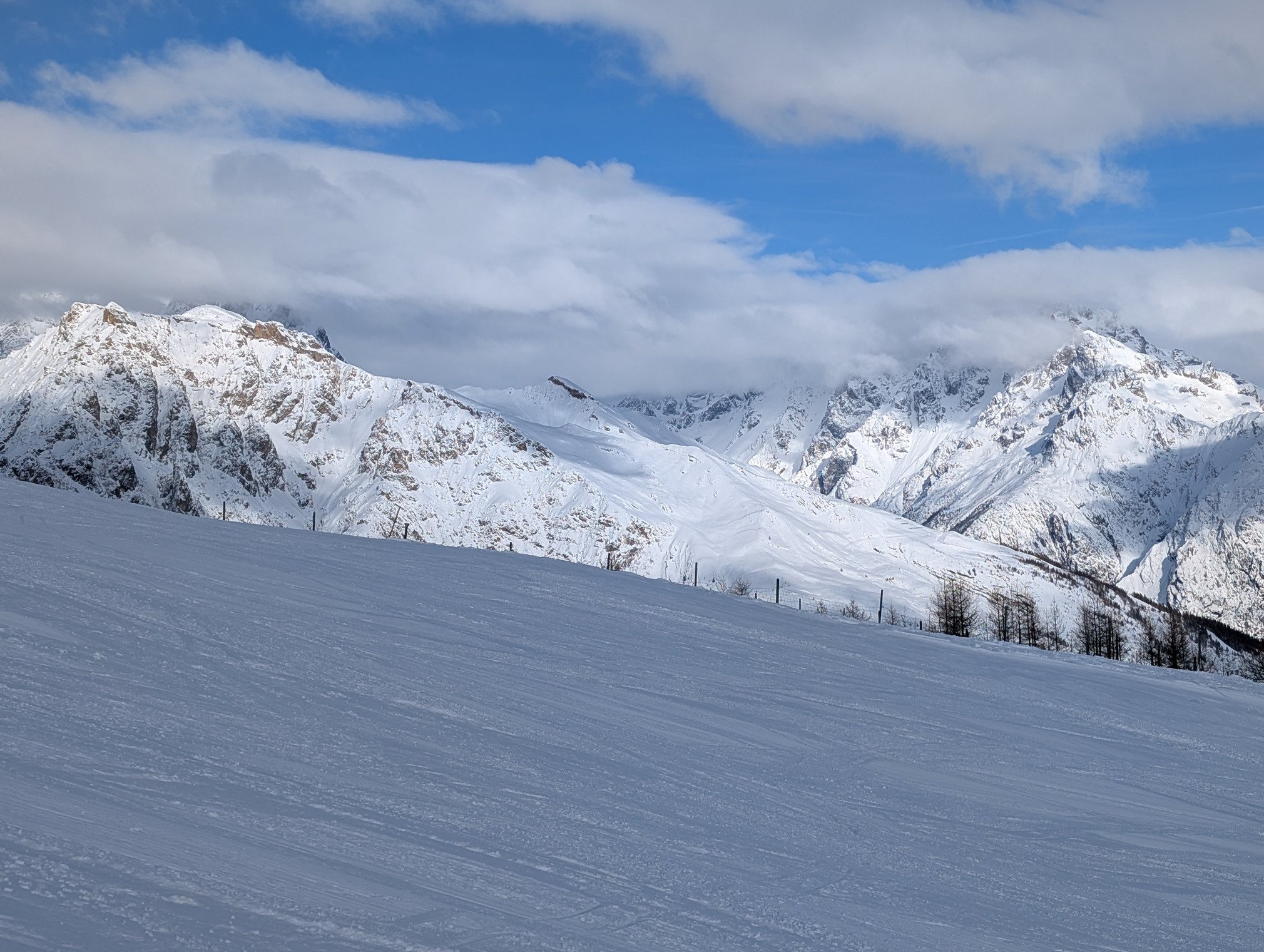 Hors pistes c'est maintenant bien tracé. Neige encore agréable au dessus de 2000m, il reste un petit peu de place pour quelques virages.