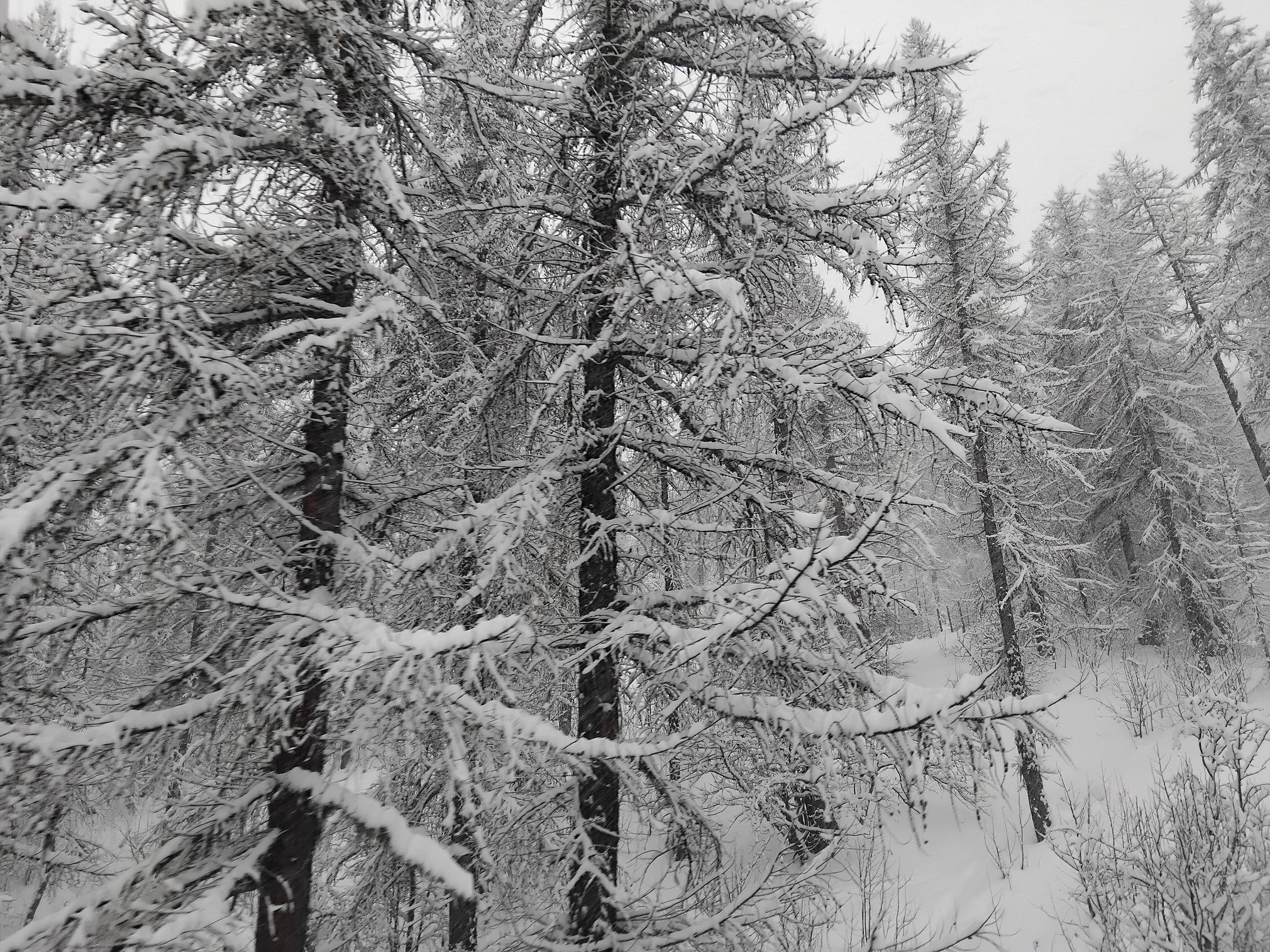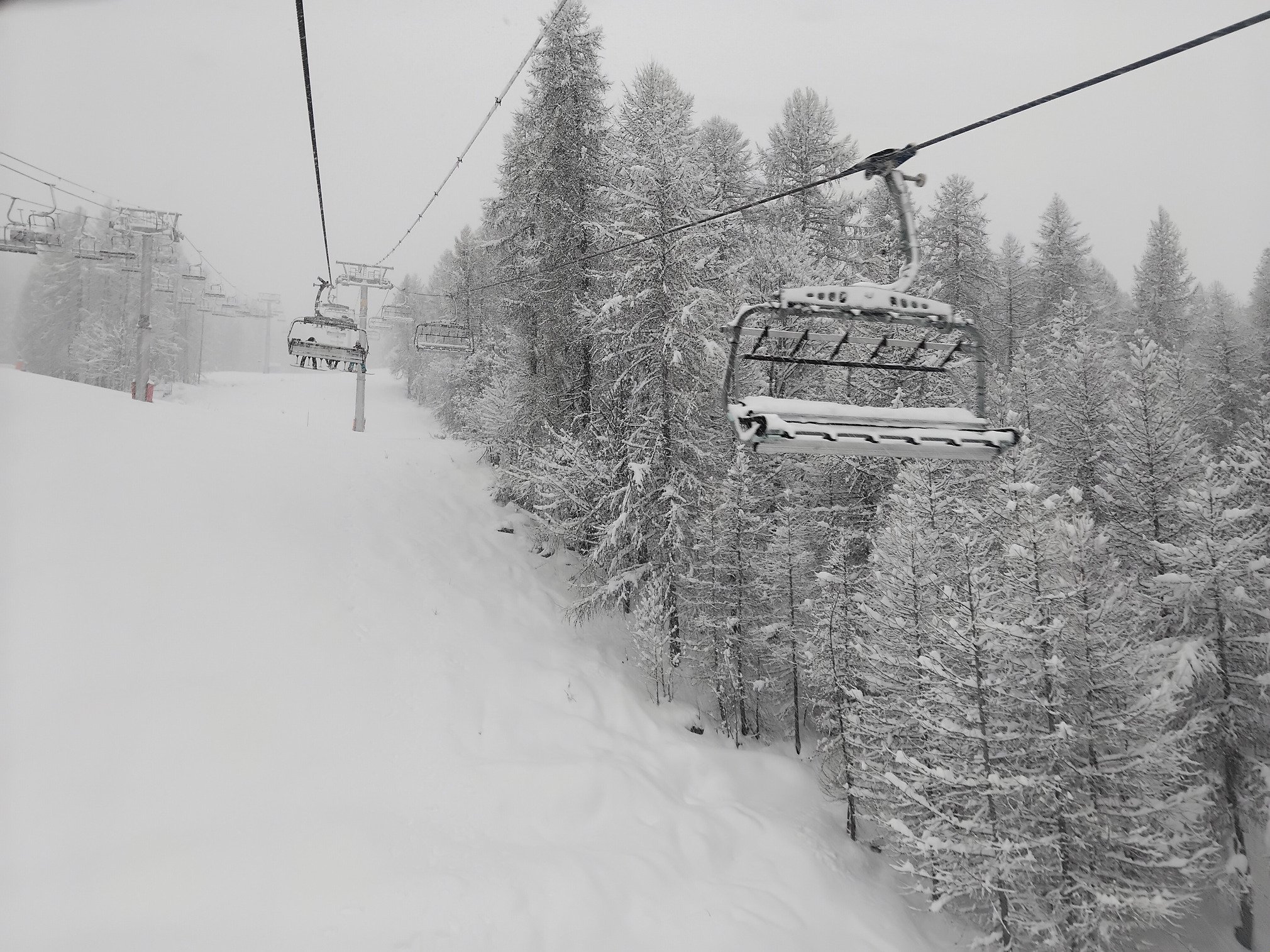 Je trace toute la journée dans les bois et sur le haut du domaine, la visi est correcte, la neige légère, ça fait plaisir.